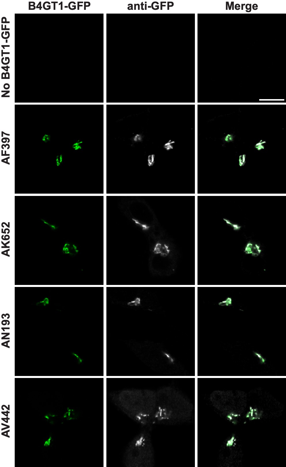 Figure 1. AF397, AK652, AN193 and AV442 labeled the Golgi complex of HEK cells expressing the GFP-tagged B4GT1 protein (in white); the signal co-localized with the signal generated by the GFP reporter (in green). No labelling was seen in non-transfected cells (“No B4GT1-GFP”). Scale bar: 10 µm.