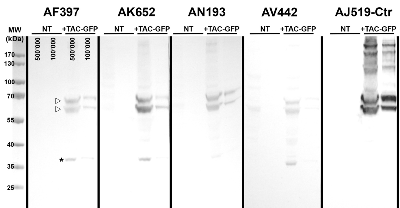 Figure 1. AF397, AK652, AN193 and AV442 specifically recognize GFP in HEK cells expressing a GFP-tagged TAC/IL2RA protein (“+TAC-GFP”). Two bands, indicated by arrowheads (shown only for AF397), correspond to different glycosylation states of the IL2RA protein. The same bands are seen for the positive control, labeled with the anti-TAC AJ519 antibody (“AJ519-Ctr”). The anti-GFP antibodies also detect free GFP (around 35 kDa, asterisk). No labelling was seen in non-transfected cells (“NT”). For each antibody and condition, two sample dilutions were used: 500’000 and 100’000 cells/well (labels shown only for AF397).