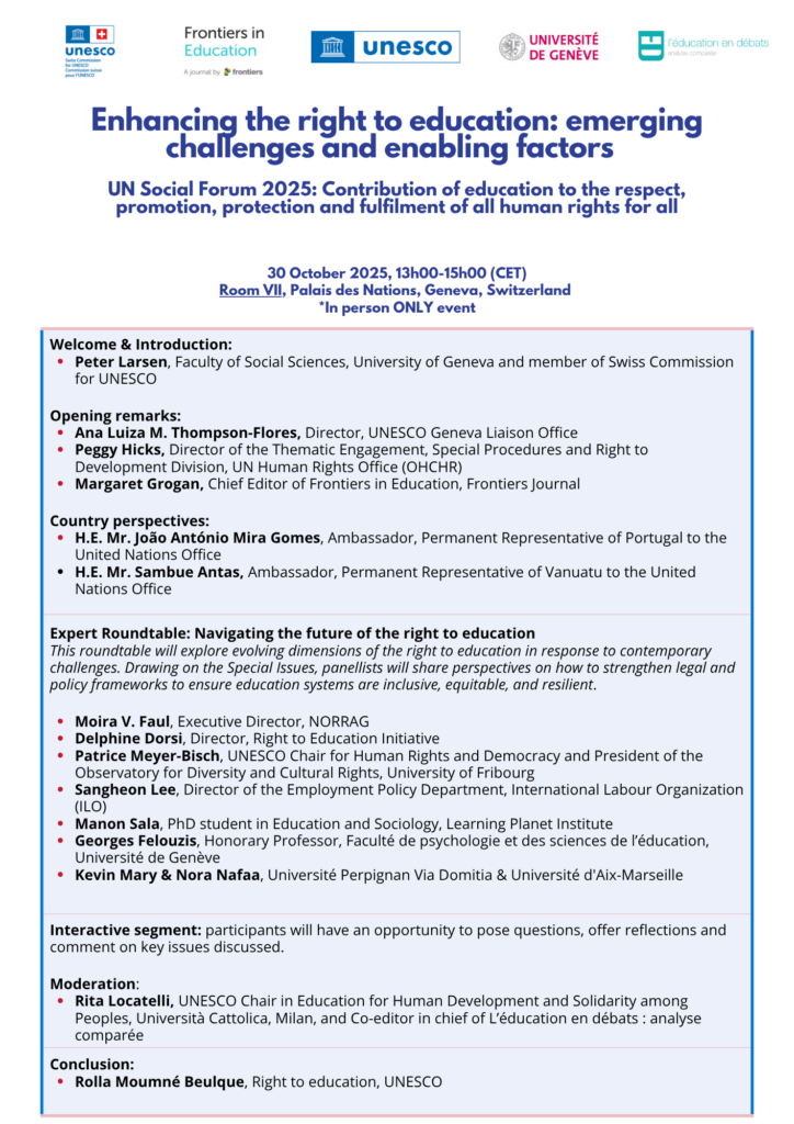 Le futur du droit à l’éducation dans un monde en transformation Rita Locatelli, Chaire UNESCO “Education for Human Development and Solidarity among Peoples” / Università Cattolica, Milan / L’éducation en débats : analyse comparée