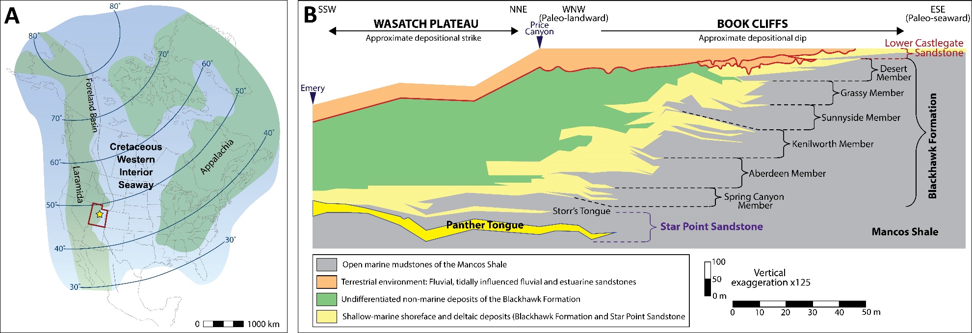 Figure 1. Geologic overview of the Panther Tongue. (A) Late Cretaceous paleogeographic configuration of North America showing the Western Interior Seaway shoreline (modified from Robinson Roberts and Kirschbaum, 1995), paleolatitudes are averages from ~90 m.y. to 60 m.y. (Irving, 1979). The red outline highlights the state of Utah and the star denotes the study area. (B) Stratigraphy of the Mesaverde Group in east-central Utah showing the Wasatch Plateau and Book Cliffs stratigraphy (modified from Hampson et al., 2011). The Panther Tongue is highlighted in bright yellow and outlined in blue.