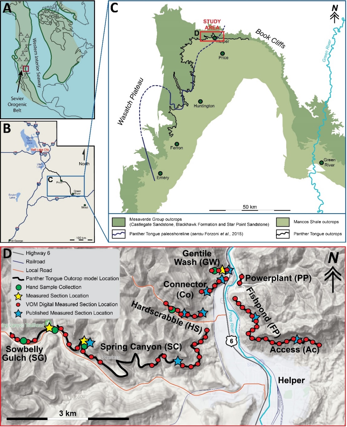 Figure 2. (A) A paleogeographic map showing field location during the Late Cretaceous relative to the Western Interior Seaway (modified from Hampson et al., 2011). (B) A map showing the location of the study area in the state of Utah. (C) A map showing the Mesaverde Group and the Mancos Shale outcrop belt in east-central Utah, highlighting the study area near Helper, UT (modified from Hampson et al., 2011; Forzoni et al., 2015; and informed by https://geology.utah.gov/apps/ intgeomap/. (D) A map showing the locations of hand samples, digitally measured sections, outcrop measured sections (including previously published examples and from this study), and photogrammetry imagery coverage. Base map from Google Maps.