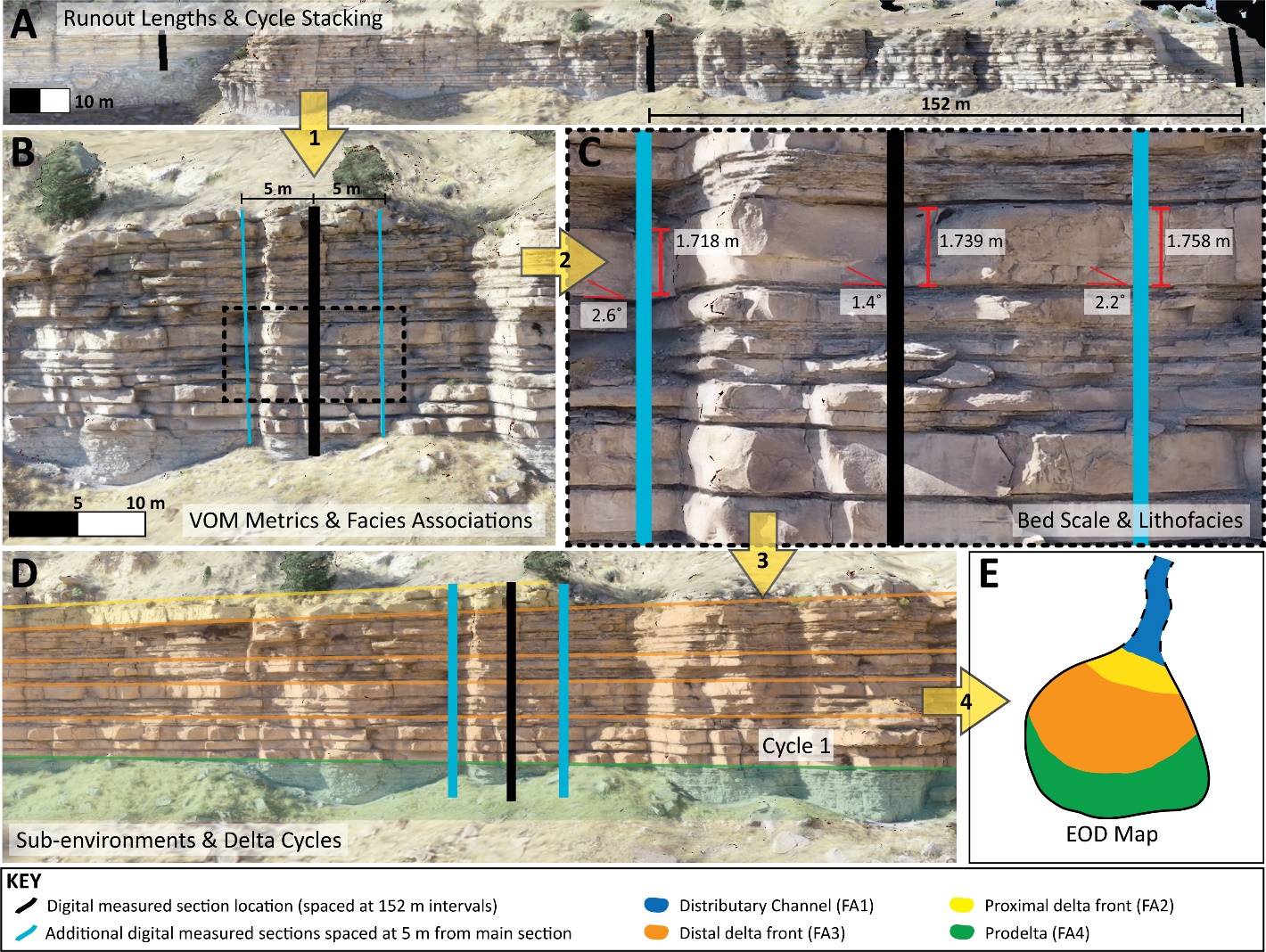 Figure 3. Summarized VOM workflow. (A) Digitally measured sections (vertical black bar) were selected and assigned every 152 m along the length of one of the eight VOMs. Each bed intersected by the digitally measured section is given a unique number to correlate between adjacent digitally measured sections and to permit runout length measurements. (B) At each VOM digitally measured section, measurements and observations are taken at three vertical locations: the central log, and 5 m to the right and left. (C) Bed thickness and dip are measured. Grain size and lithofacies are identified for each bed in the central log and the logs 5 m to the left and right – three individual bed measurements are taken at each of the 60 locations. (D) The lithofacies identified in each digitally measured section are grouped into facies associations, these are mapped laterally through adjacent digitally measured sections. (E) Using the mapped facies associations, depositional maps of specific deltaic depositional cycles (i.e., parasequences) are reconstructed.