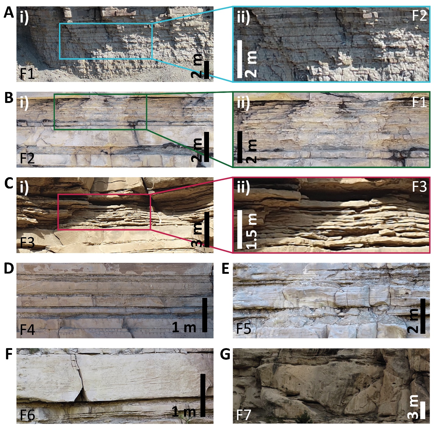 Figure 4. Images showing the seven lithofacies observed in this study: (A-i) Siltstones (F1); (A-ii) A close-up image of the siltstone deposits that comprise F1; (B-i) Mud-prone heterolithics (F2); (B-ii) A close-up image of the mud-prone heterolithics that comprise F2; (C-i) Sand-prone heterolithics (F2); (C-ii) A close-up image of the sand-prone heterolithics that comprise F3; (D) Very fine- to fine-grained sandstone deposits (F4); (E) Fine- to medium-grained sandstone deposits (F5); (F) Cross-bedded sandstone (faint, low-angle laminations) (F6); (G) Medium-grained sandstones with mudstone rip-up clasts (F7).
