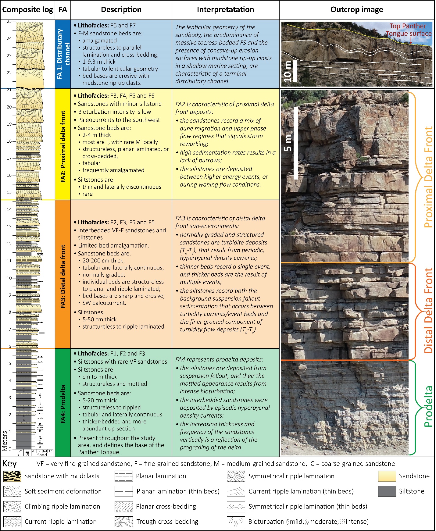 The seven lithofacies were grouped into four facies associations (Fig. 5) that define and characterize specific deltaic sub-environments, from proximal to distal: distributary channel (FA1), proximal delta front (FA2), distal delta front (FA3), and prodelta (FA4) (see Fig. 5 for component lithofacies). These are consistent with previous interpretations of the Panther Tongue (Newman & Chan, 1991; Enge et al., 2010b; Olariu et al., 2010). They were mapped throughout the 13 km of VOMs, and have been included in the VOM metric database.