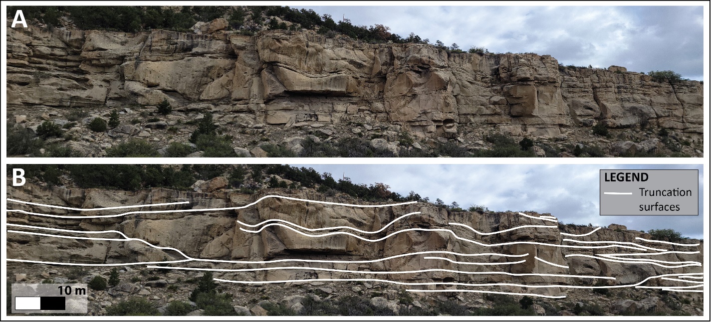 Figure 6. Distributary channel outcrop image. (A) A strike-oriented photograph of the Panther Tongue sandstone at the western end of the field area. (B) Interpreted distributary channels showing truncation of sandstone beds (traced in white).