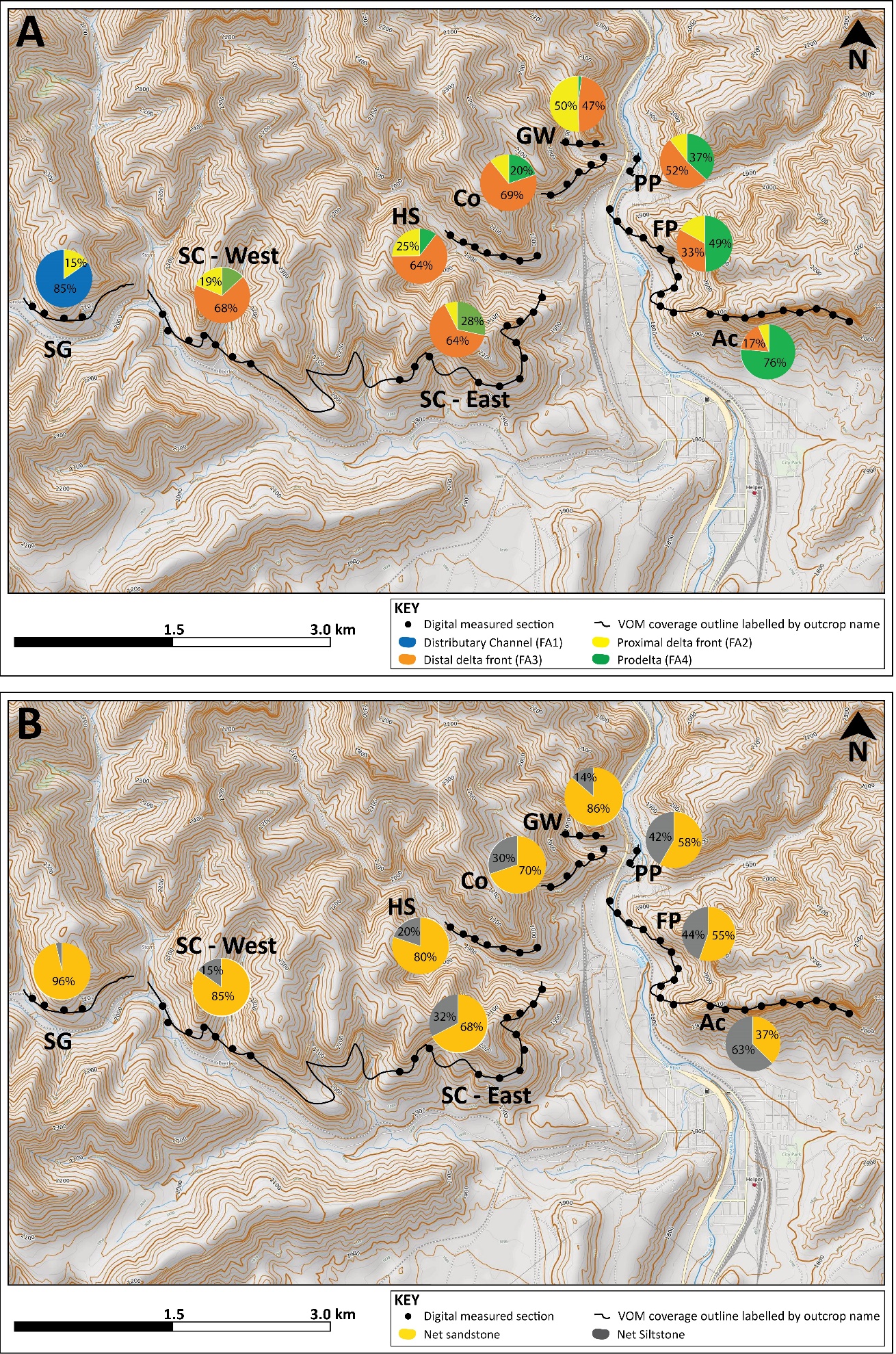 Figure 10. Spatial trends through the study area. Properties are calculated by outcrop and plotted through the study area to assess possible spatial trends. (A) NTG is represented with pie charts showing the percent sand (yellow) to percent silt (grey). (B) Sub-environment proportions present at VOM digitally measured section. Base maps are topographic maps from www.caltopo.com.