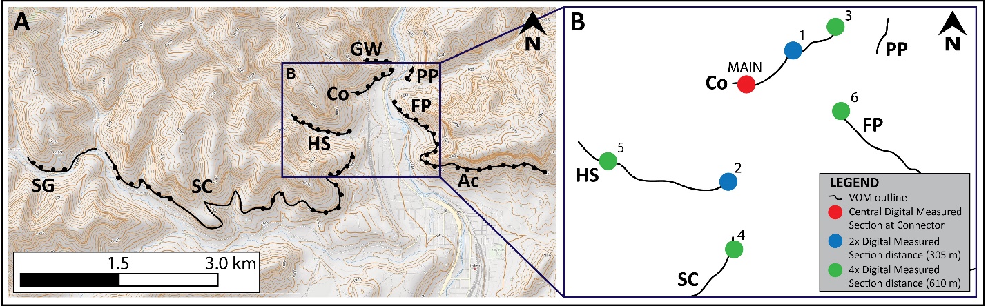 Figure 11. VOM images showing specific interpreted delta cycles. (A) Map showing the area covered by VOM and highlighting the locations of the images shown in B-D (acronyms refer to outcrop names; see Fig. 2 for locations). Base map is from www.caltopo.com; (Bi) Uninterpreted image showing the Powerplant VOM Cycles 1 and 2; (Bii) Interpreted image showing the Powerplant VOM Cycles 1 and 2; (Ci) Uninterpreted image showing part of the northern Spring Canyon VOM that shows Cycle 4; (Cii) Interpreted image showing part of the northern Spring Canyon VOM that shows Cycle 4; (Di) Uninterpreted image showing a view of western Spring Canyon VOM showing Cycles 5 and 6. (Dii) Interpreted image showing a view of western Spring Canyon VOM showing Cycles 5 and 6.