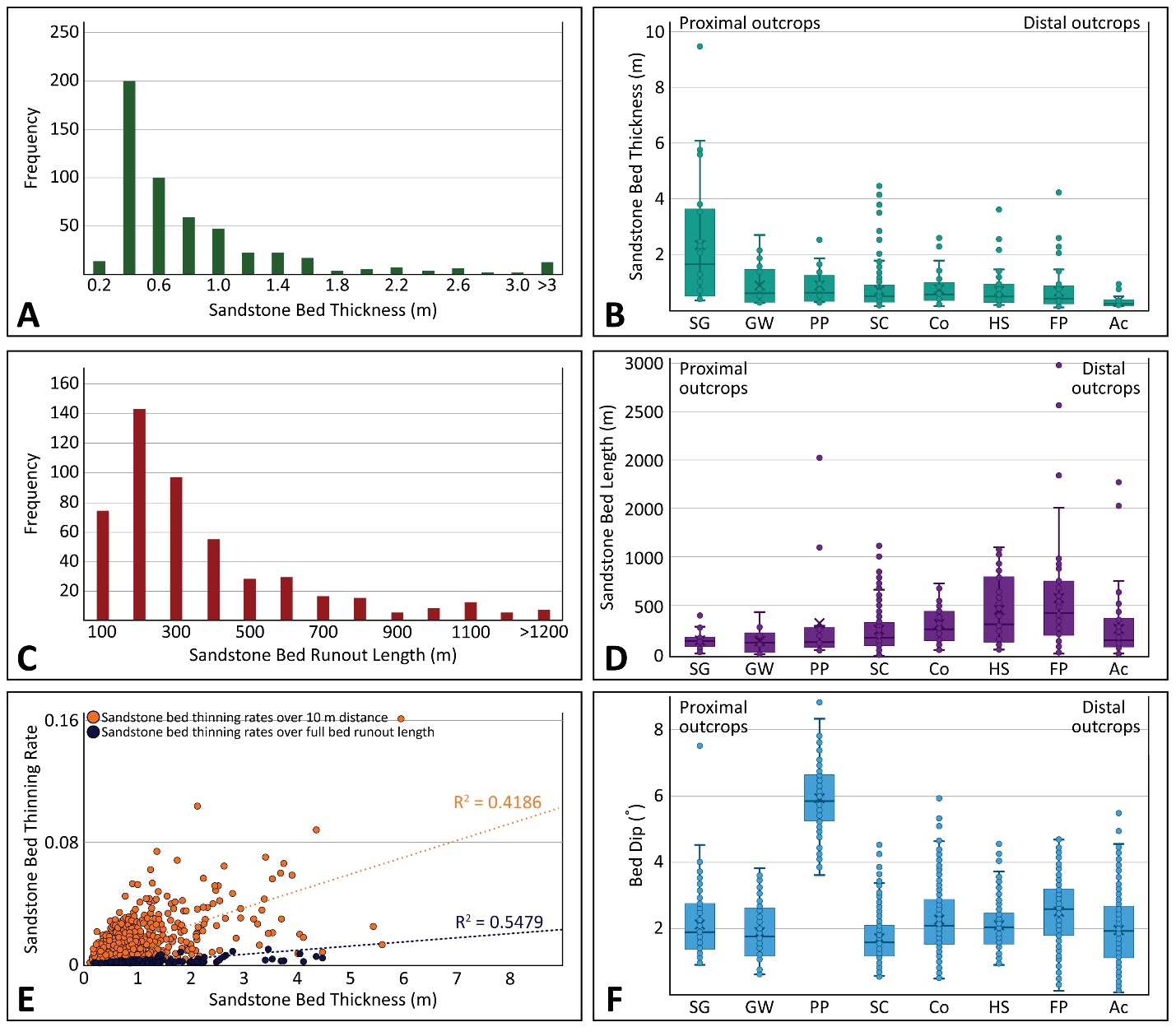 Figure 7. Sandstone metrics derived from 60 VOM digitally measured sections. (A) Frequency plot displaying the maximum sand thickness. (B) Maximum sand thickness binned by outcrop from proximal (left) to distal (right) – SG = Sowbelly Gulch; GW = Gentile Wash; PP = Powerplant; SC = Spring Canyon; Co = Connector; HS = Hard Scrabble; FP = Fish Pond; Ac = Access (see Fig. 2 for locations). (C) Frequency plot displaying sandstone bed runout length. (D) Runout lengths binned by outcrop from proximal (left) to distal (right). (E) Sandstone thinning rates calculated over 10 m (orange) and measured runout length (dark blue). (F) Apparent bed dip binned by outcrop from proximal (left) to distal (right).