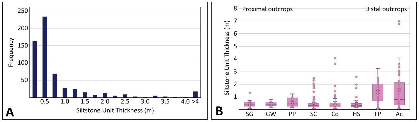 Figure 9. Siltstone metrics derived from the 60 VOM digitally measured sections. (A) Frequency plot of siltstone unit thickness. (B) Siltstone unit thickness binned by outcrop from proximal (left) to distal (right); see Fig. 2 for outcrop locations.