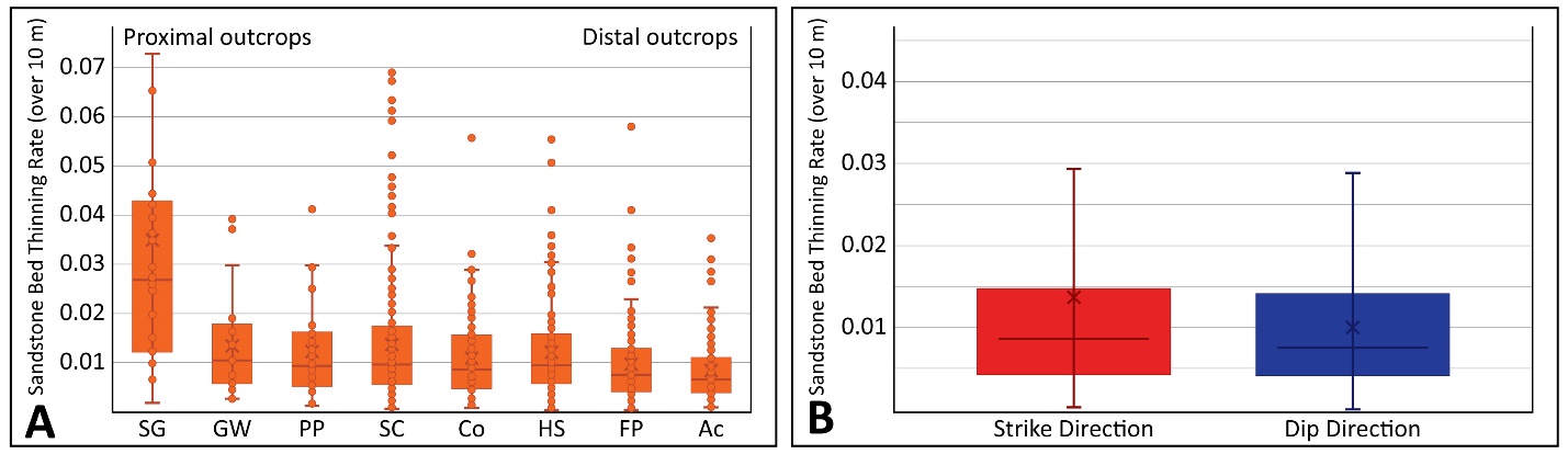 Figure 8. Small-scale (<10 m) sandstone bed thinning rates. (A) Histogram showing the small-scale sandstone bed thinning rates by outcrop orientation from proximal (left) to distal (right), see Fig. 2 for outcrop locations. (B) Small-scale sandstone bed thinning rates grouped by outcrop orientation.