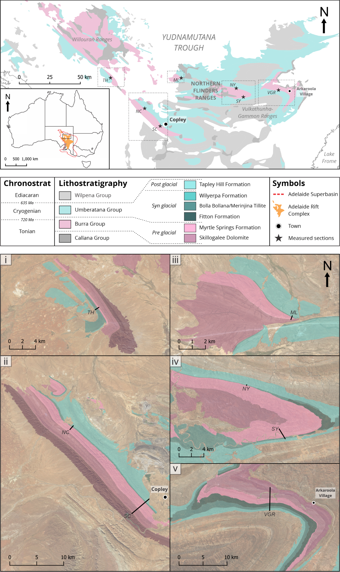 Figure 1. Geological map of Neoproterozoic lithostratigraphic groups in the Adelaide Rift Complex, northern Flinders Ranges, South Australia. Insert shows position of Adelaide Rift Complex within Australia. Satellite images of fieldwork locations overlain by stratigraphic formations. Black line denotes the location of the section measured. (i) TH = Termination Hill (ii) NC = North Copley, SC = South Copley (iii) ML = Mount Lyndhurst (iv) NY = North Yankaninna, SY = South Yankaninna (v) VGR = Vulkathunha-Gammon Ranges.