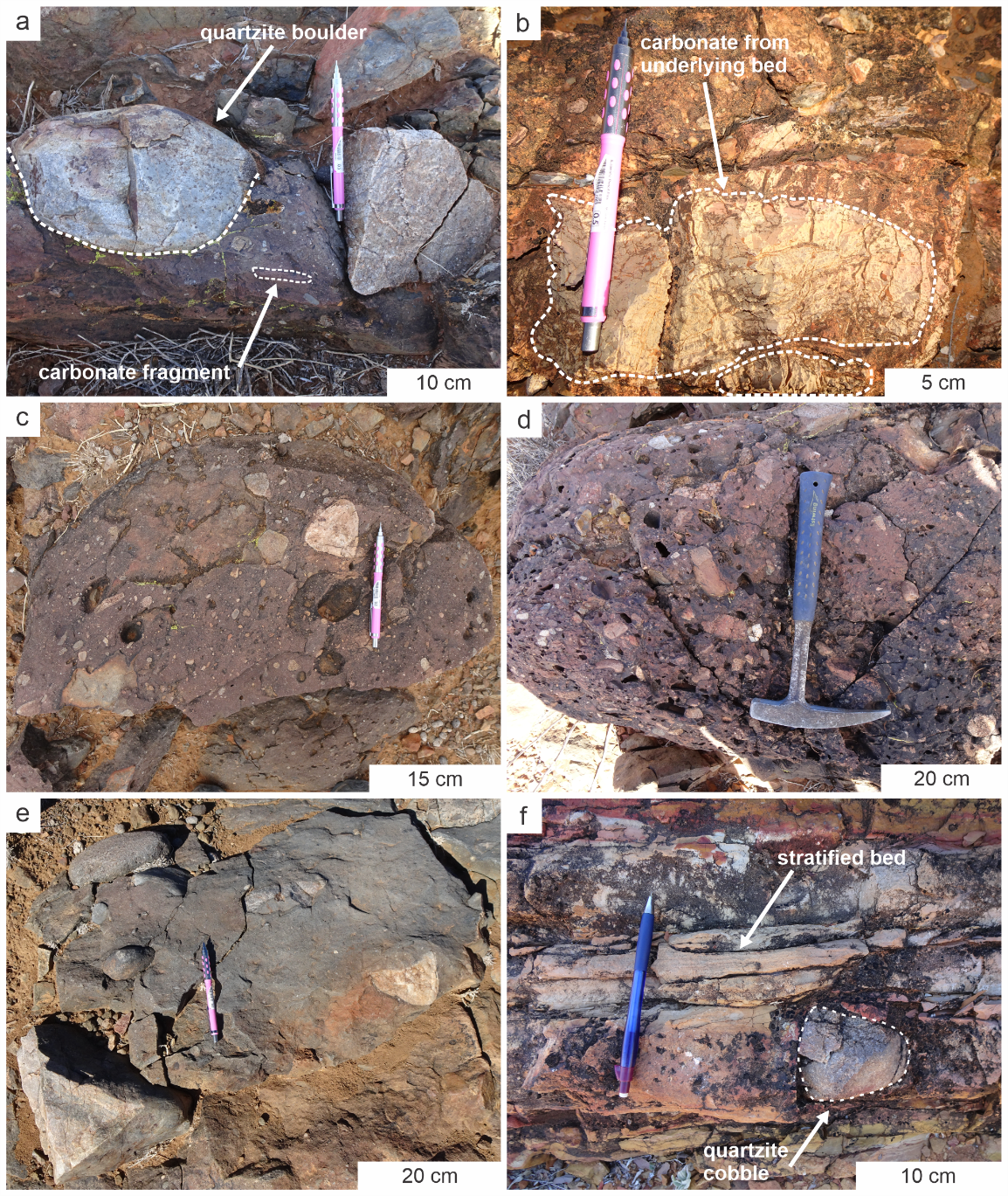 Figure 6. Key lithofacies and sedimentary structures in ice-margin setting. (a) Stratified diamictite, LF9. Clast-poor diamictite with quartzite cobble. South Copley section. (b) Massive diamictite, LF10. Clast-rich diamictite with carbonate cobble from underlying bed. Termination Hill section. (c) Massive diamictite, LF10. Clast-rich diamictite with pebble to cobble sized clasts in mudstone matrix. Vulkathunha-Gammon Ranges section. (d) Massive diamictite, LF10. Clast-rich diamictite with pebble sized clasts in mudstone matrix. South Yankaninna section. (e) Massive diamictite, LF10. Clast-poor diamictite with angular quartzite boulder in mudstone matrix. Vulkathunha-Gammon Ranges section. (f) Massive diamictite, LF10. Clast-rich diamictite with rounded quartzite bounder in mudstone matrix. South Yankaninna section.