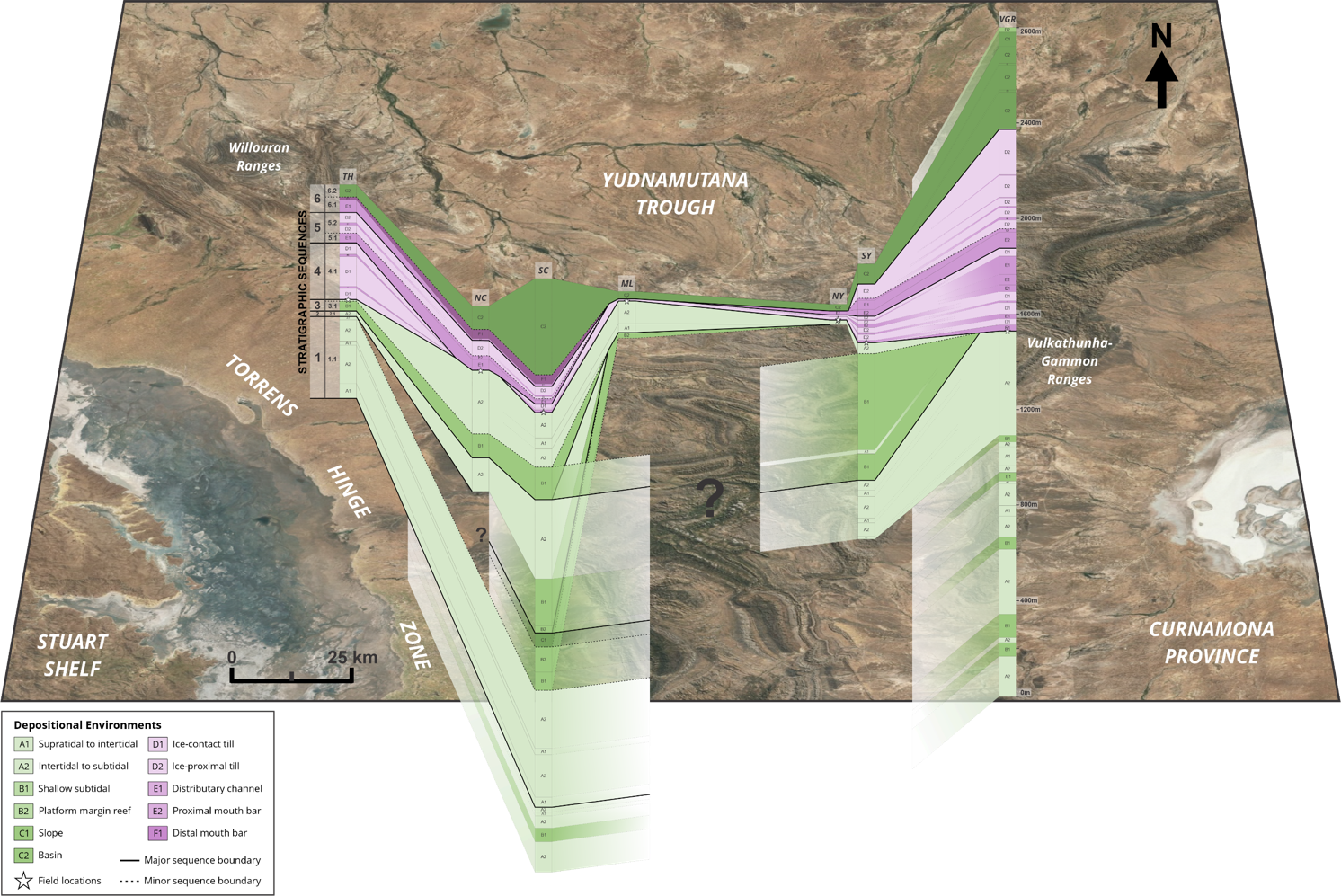The spatial and temporal distribution of depositional environments across the northern Flinders Ranges was incorporated into a sequence stratigraphic model based on lithofacies stacking patterns and stratigraphic relationships. Interpretations were then made as to the controls on sedimentary architecture within the basin [e.g., variations in accommodation and sediment input, driven by fluctuations in tectonism (i.e., subsidence or uplift), eustacy, and sediment supply; Catuneanu, 2006].