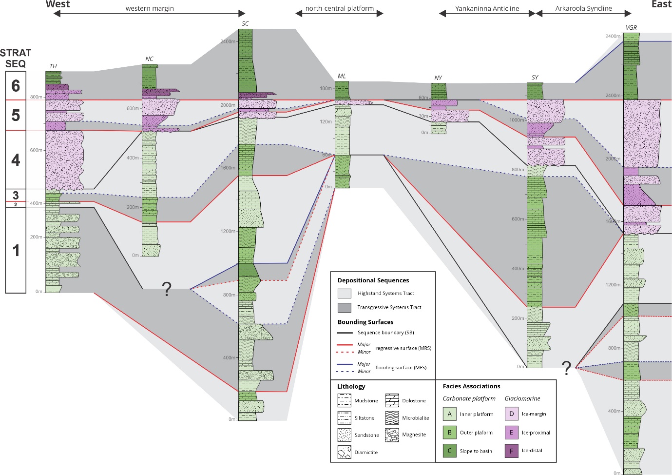 Literature from early studies in South Australia provide a foundation for the stratigraphy and tectonic evolution of the Adelaide Superbasin (e.g., Howchin, 1929; Segnit, 1939; Mawson & Sprigg, 1950; Preiss, 1987; Preiss et al., 1993), while contemporary sedimentological research presents more detailed analyses of specific formations and locations within the basin (Hill & Walter, 2000; McKirdy et al., 2001; Frank & Fielding, 2003; Giddings et al., 2009; Giddings & Wallace, 2009a, 2009b; Preiss et al., 2009, 2011; Fromhold & Wallace, 2011, 2012; Grey et al., 2011; Hood et al., 2011, 2016, 2018; Hood & Wallace, 2012, 2014, 2015; Le Heron et al., 2011, 2011a, 2014; Busfield & Le Heron, 2014; Lechte & Wallace, 2015, 2016; Wallace et al., 2015; Counts et al., 2016; Cox et al., 2018; Corkeron & Slezak, 2020; O’Connell et al., 2020; Virgo et al., 2021). In addition, advances in understanding the chronostratigraphy and provenance of the superbasin have established a firmer temporal framework and tectonic setting for the evolving basin (Cox et al., 2018; Armistead et al., 2020; Lloyd et al., 2020; 2022b). Although these studies have contributed immensely to our understanding of Neoproterozoic palaeoenvironments and stratigraphic evolution through this time, they have not captured the wider facies architecture across the basin. In particular, basin-scale architecture within the context of sequence stratigraphic changes related to active rifting and climatically driven sea level fluctuations, which resulted from the breakup of Rodinia and the Cryogenian glaciations.