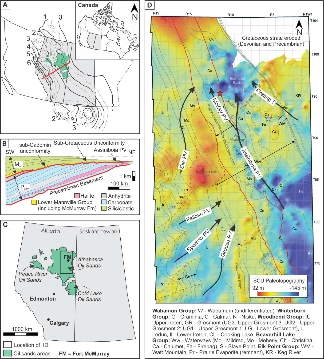 The deposits of the McMurray Fm overlie the SCU (Carrigy, 1959; Mossop & Flach, 1983; Frazier & Schwimmer, 1987; Hein et al., 2012). The paleotopographic surface of the SCU resembles a series of north-south-oriented paleovalleys carved into the underlying Devonian carbonate (Carrigy, 1959; Flach & Mossop, 1985; Hein et al., 2012; Hauck et al., 2017). In the AOSR, the trunk paleovalley is referred to as the Assiniboia Paleovalley (see Christopher, 1984), into which multiple tributary paleovalleys debouched (e.g., Sparrow, Grouse and Pelican paleovalleys in the southwest, and Firebag Tributary in the east; Figure 1D) (see Hein, 2006; Château et al., 2019).