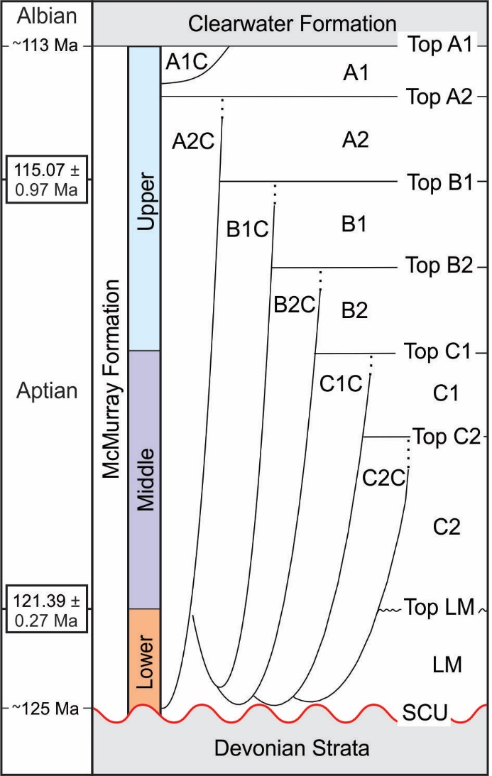 Figure 2. Sequence stratigraphic framework developed for the McMurray Fm (right column) in the southern Athabasca Oil Sands Region (AOSR). The framework is modified after Château et al. (2021). The depositional units made of parasequence sets (A1, A2, B1, B2, C1, C2, LM) are cross-cut by autochthonous channel belts and allochthonous incised valleys (A1C, A2C, B1C, B2C, C1C, C2C). The lithostratigraphic framework commonly applied to the McMurray Fm in the Northern AOSR is shown by the colored column. The McMurray Fm overlies the Sub-Cretaceous Unconformity (SCU). Ages (left column) are provided for U-Pb dated ash beds (black boxes) at the top of the lower McMurray Fm (Top LM) and the top of B1 (with errors at the 95% confidence interval) (after Rinke-Hardekopf et al., 2019, 2022).