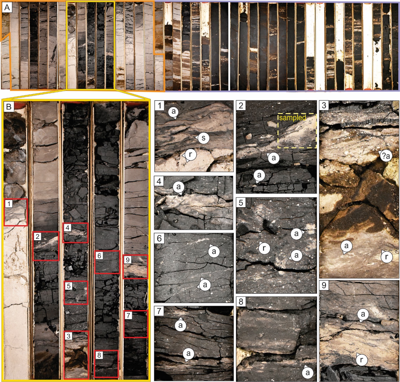 Figure 3. (A) Overview of the sampled core: 1AA/11-35-094-11W4. The bottom of the core is the bottom left corner and stratigraphic upsection increases towards the right. Each core column is 75 cm tall and 7 cm wide. The orange box highlights the lower McMurray Fm, and the purple box demarcates the middle McMurray Fm. The yellow box marks the interval expanded in (B). (B) Top of the lower McMurray with nine ash beds and laminae visible. Close-ups of ash layers are shown in (1)–(9). The ash beds and laminae (a) are reworked to varying degrees, and show soft-sediment deformation (s) and roots (r). The sampled ash bed occurs in (2), within a coal layer (yellow dashed box).
