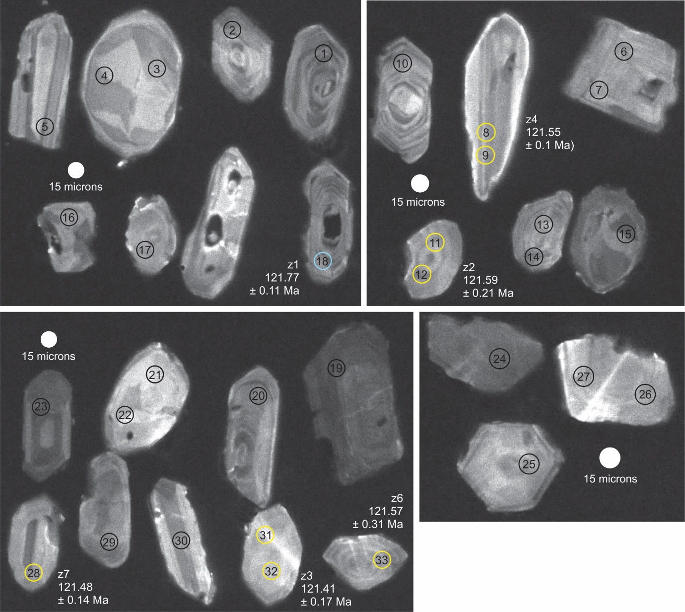 Figure 4. Twenty-six sharply faceted zircon grains analyzed by LA-ICPMS. Circles demarcate the laser ablation spots. Yellow and blue circles indicate the zircon (z1–z4, z6–z7) that yielded Cretaceous LA-ICPMS dates. CA-TIMS derived dates are shown with errors at 2 σ . The zircon with the blue circle was omitted from the weighted mean date calculation.