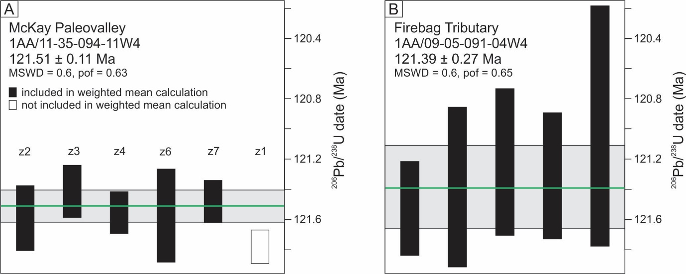 Figure 5. CA-TIMS dates from single zircon grains from the lower McMurray Fm ash sample in A) McKay Paleovalley and B) Firebag Tributary (modified after Rinke-Hardekopf et al., 2019). Values are plotted with Isoplot 4.15 (Ludwig, 2003). Errors on individual analyses are plotted at 2σ and errors for the weighted mean dates are calculated at the 95% confidence interval. Grey boxes represent the weighted mean dates. MSWD is the mean squared weighted deviation and pof refers to the probability of fit.