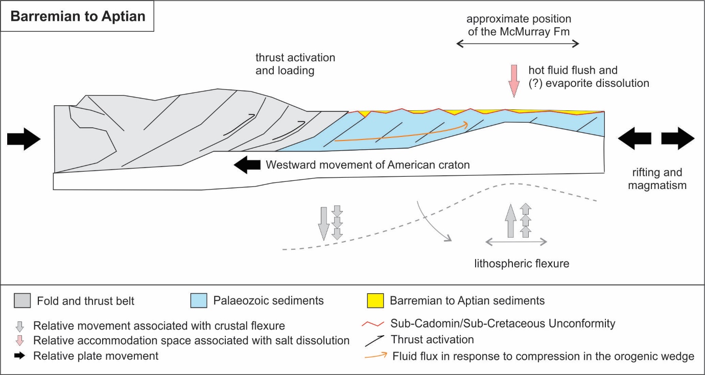 Figure 6. Schematic representation of the tectonic setting of the McMurray Fm during the Barremian to Aptian. Onset of shortening in the foreland basin system was accompanied with renewed a ctivation of thrusts in the orogenic wedge of the southern Canadian Cordillera, fluid flush towards the distal foreland basin system , and flexural steepening accompanied with uplift of the forebulge and rifting in the East and North of the McMurray Fm (m odified after Pană et al., 2019 ) .