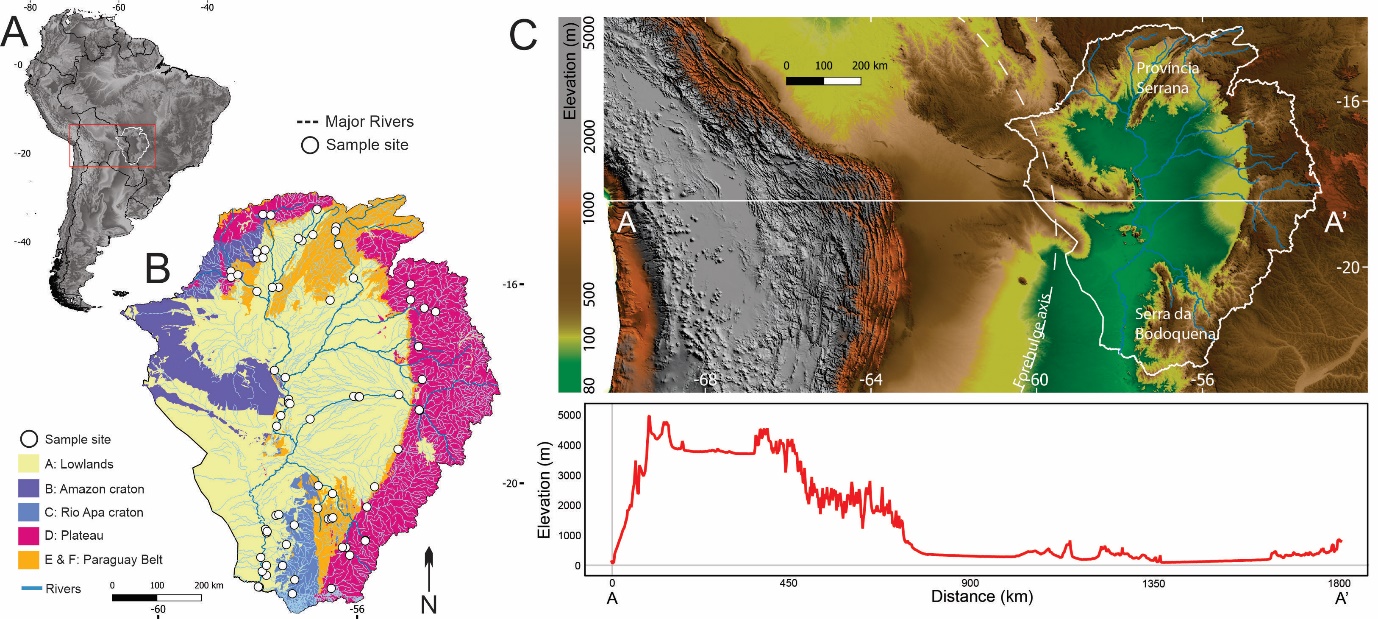 Figure 1. A) Upper Paraguay River Basin (white outline) in South America with major rivers (blue lines). B) Pantanal Basin sediment generation (provenance) regions with hydrologic map, referenced throughout the text. Much of the areas covered at the surface by wetlands are designated as lowlands, in contrast with the fringing cratons and the plateau. C) GTOPO30 digital elevation model of South America (USGS, 1996), including a simplified topographic cross-section A-A’from Google Earth©. The forebulge axis and the Província Serrana and Serra da Bodoquena mountain ranges are labeled.