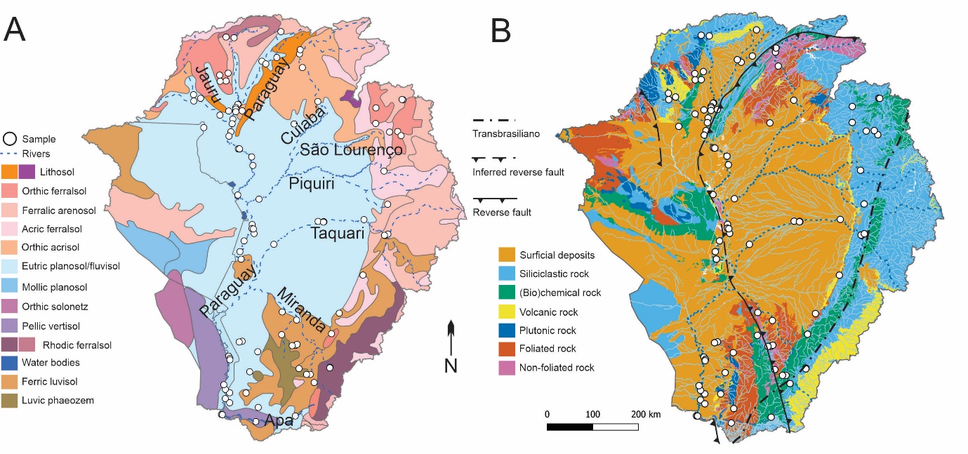 Figure 2. A) Soil map for the Pantanal Basin (FAO, 1970). The primary soil classes are eutric planosol/fluvisol (Benedetti et al., 2011). B) Geology of the Pantanal Basin and drainage network, with major faults in the region. The plateau is dominated by siliciclastic sedimentary rock, whereas metamorphic rocks are restricted to the cratons and Paraguay Belt. Geologic maps were obtained from Bolivia (Dirección de Ordenamiento Territorial, Gobierno Autónomo Departamental de Santa Cruz), Paraguay (Vice Ministerio de Minas y Energía), and Brazil (Serviço Geológico do Brasil, CPRM). Faults were drawn based on published studies (Barboza et al., 2018; Cedraz et al., 2020; Faleiros et al., 2016; Rivadeneyra-Vera et al., 2019; Rizzotto & Hartmann, 2012; Warren et al., 2015).