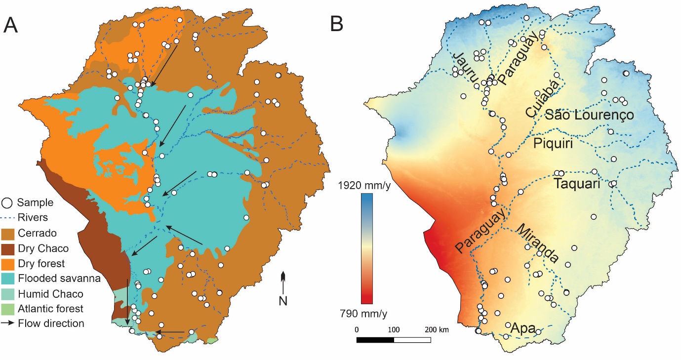 Figure 3. A) Vegetation ecoregions of the Pantanal Basin (Olson et al., 2001). The primary vegetation of the Pantanal consists of flooded savanna and cerrado (tropical savanna). B) Mean annual precipitation (mm/y) from WorldClim database (Fick & Hijmans, 2017).