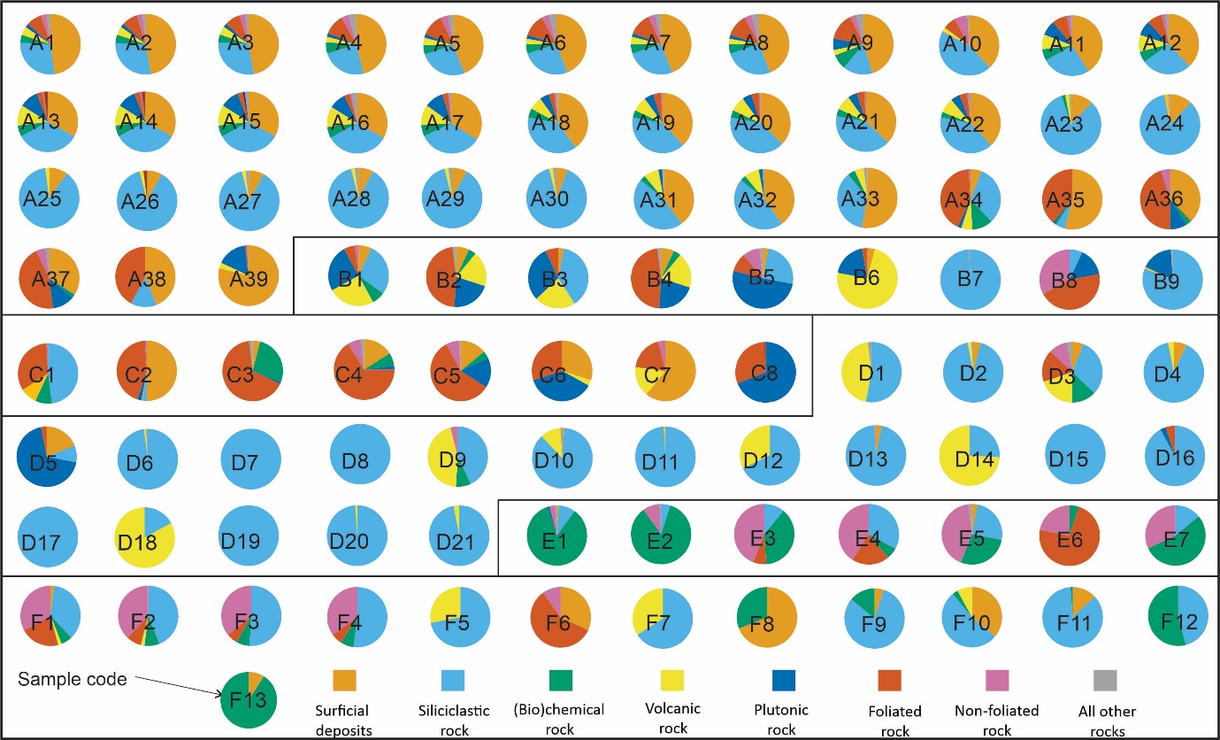 Figure 5. Pie charts showing relative proportions of lithologies (see Figure 2B) in each sample sub-watershed resulting from pour point analysis. For each region, samples were organized by decreasing watershed size ordered left to right and top to bottom. Regions are A, Lowlands; B, Amazon craton; C, Rio Apa craton; D, Plateau; E, S outh Paraguay Belt; F, N orth Paraguay Belt.