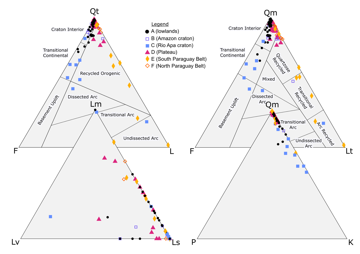 Figure 6. Ternary plots of sand composition in the Pantanal Basin and its provenance regions (Dickinson, 1985). The vertices were Qt (sum of monocrystalline quartz, polycrystalline quartz, and chert), F (sum of plagioclase and potassium feldspar), and L (sum of lithic igneous, metamorphic, and sedimentary grains). Qm (monocrystalline quartz), F (plagioclase and potassium feldspar), and Lt (polycrystalline quartz and lithic igneous, metamorphic, and sedimentary grains). Lm (lithic metamorphic), Lv (lithic volcanic), and Ls (lithic sedimentary). Qm (monocrystalline quartz), P (plagioclase) and K (potassium feldspar).