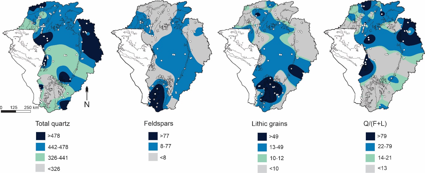 Figure 7. Spatial interpolation maps of the Upper Paraguay River Basin showing raw point counts for Qt (sum of monocrystalline quartz, polycrystalline quartz, and chert), F (sum of plagioclase and potassium feldspar), and L (sum of lithic igneous, metamorphic, and sedimentary grains) and Q t /(F+L) . Blank areas have no data.