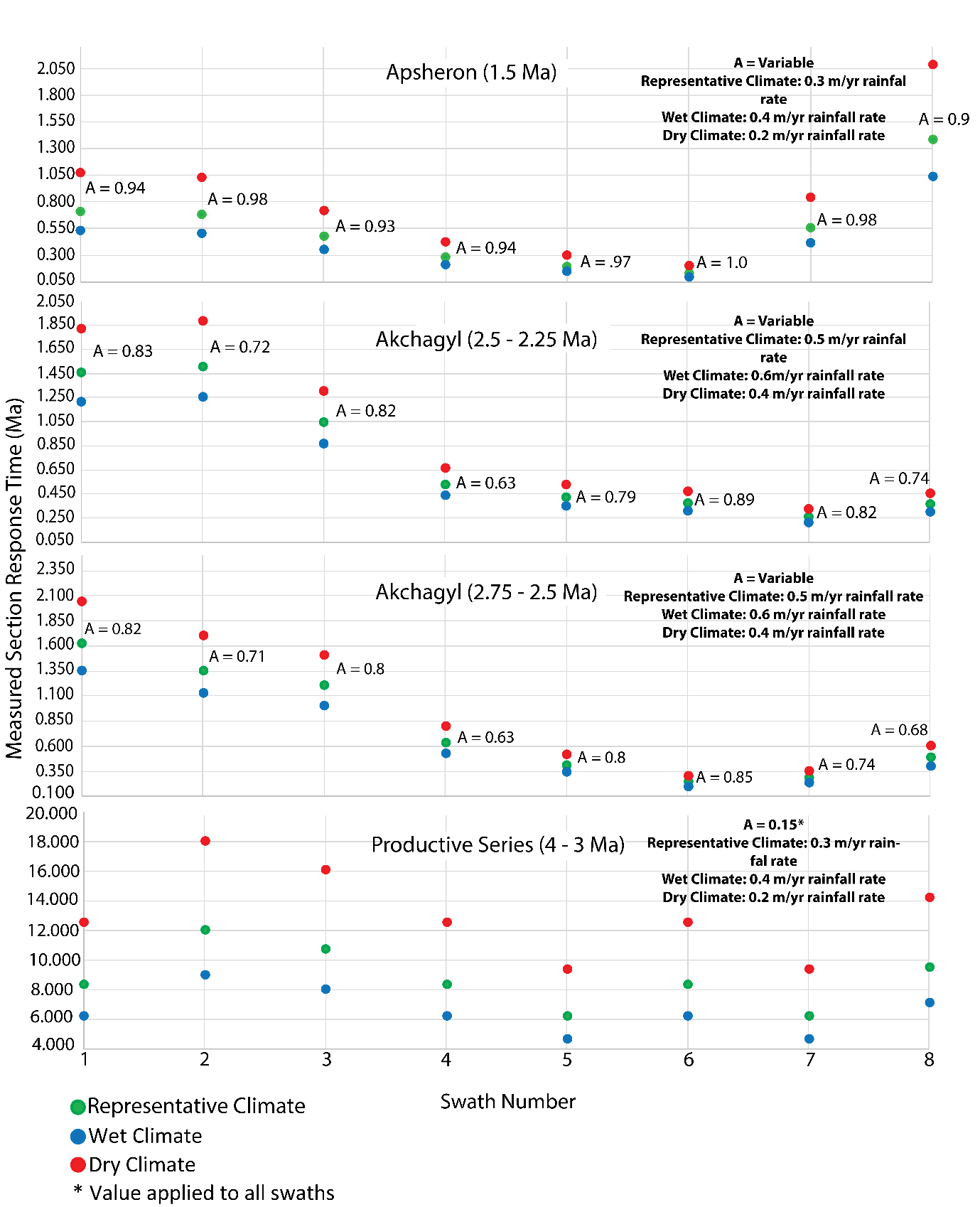 To address this issue, an A value between 0.15 and 1.0 was calculated by taking the paleogeographic maps and determining a weighted average value of A, by assessing the proportion of braided to meandering systems along the swath of interest (i.e., a swath that crosses a greater proportion of a meandering environment will have an A value closer to 1.0 and vice versa). As such, we don’t formally quantify uncertainty in the A value we use, there is certainly variability in fluvial environments not captured (e.g., a gradational change over distance along a fluvial system) in our reconstructions that impart uncertainty into our response time calculations.