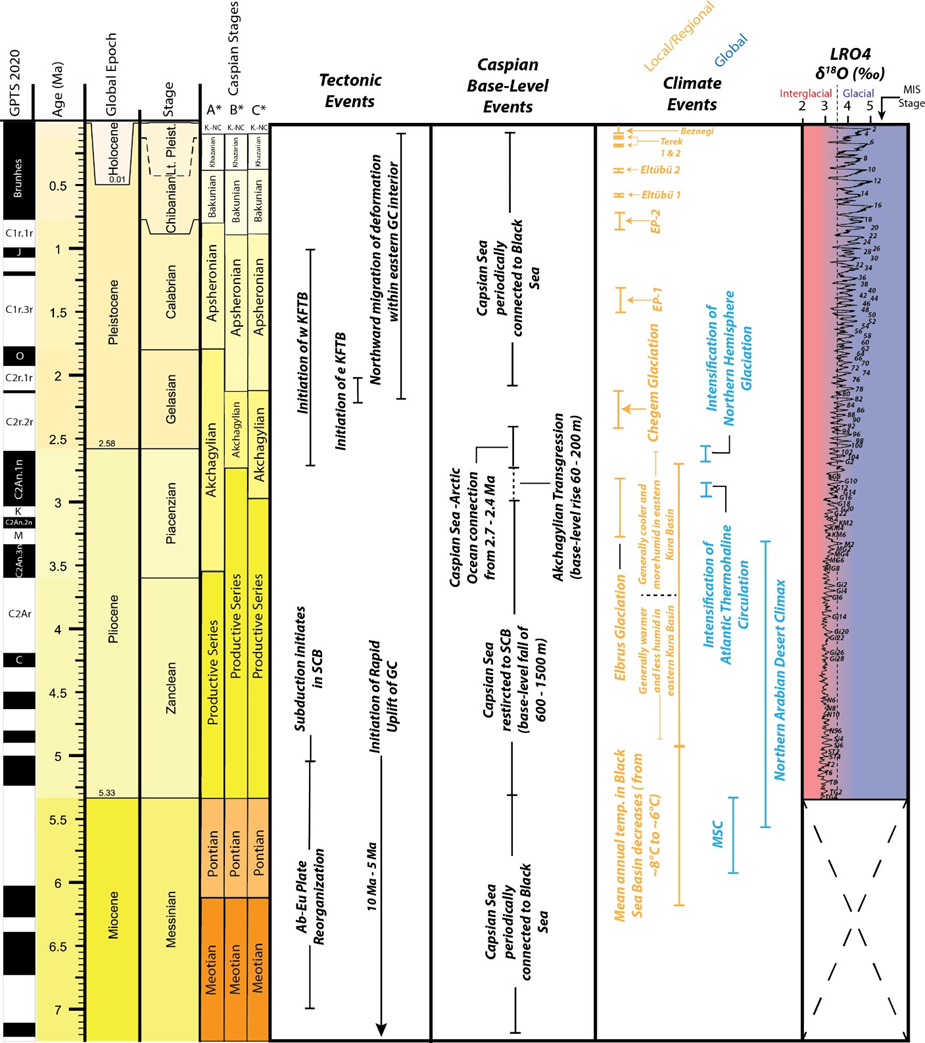 Figure 4. From left to right: Synthesis of the Caspian Stages and their associated boundaries relative to the GPTS 2020 (from Raffi et al. 2020). A* = Long Akchagylian, B* = Short Akchagylian, C* = Intermediate Akchagylian. Synthesis of the late Cenozoic tectonic, Caspian Sea Base Level, and regional and global climatic events from within and around the Caucasus. LRO4 Stacked δ18O and associated MIS stages for the Quaternary to Pliocene are derived from the 57 benthic δ18O records complied and correlated by Lisiecki & Raymo (2005). The age range for Mediterranean Salinity Crisis (MSC) from Hsü et al., 1977; Krijgsman et al., 1999. The age range for the North Arabian Desert Climax (NADC) from Böhme et al., 2021.