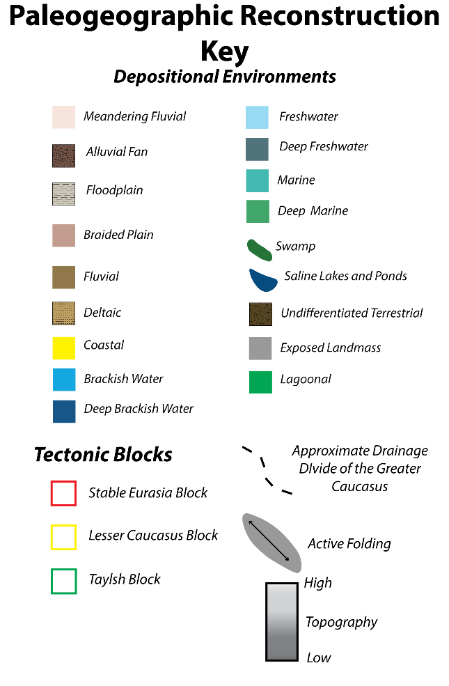 Figure 8. Paleogeographic map of the Kura Basin, Greater and Lesser Caucasus during the Akchagylian at ~2.5 – 2.25 Ma. See key (Figure 5) and text for depositional environments. See Figure 5 for symbology discussion.