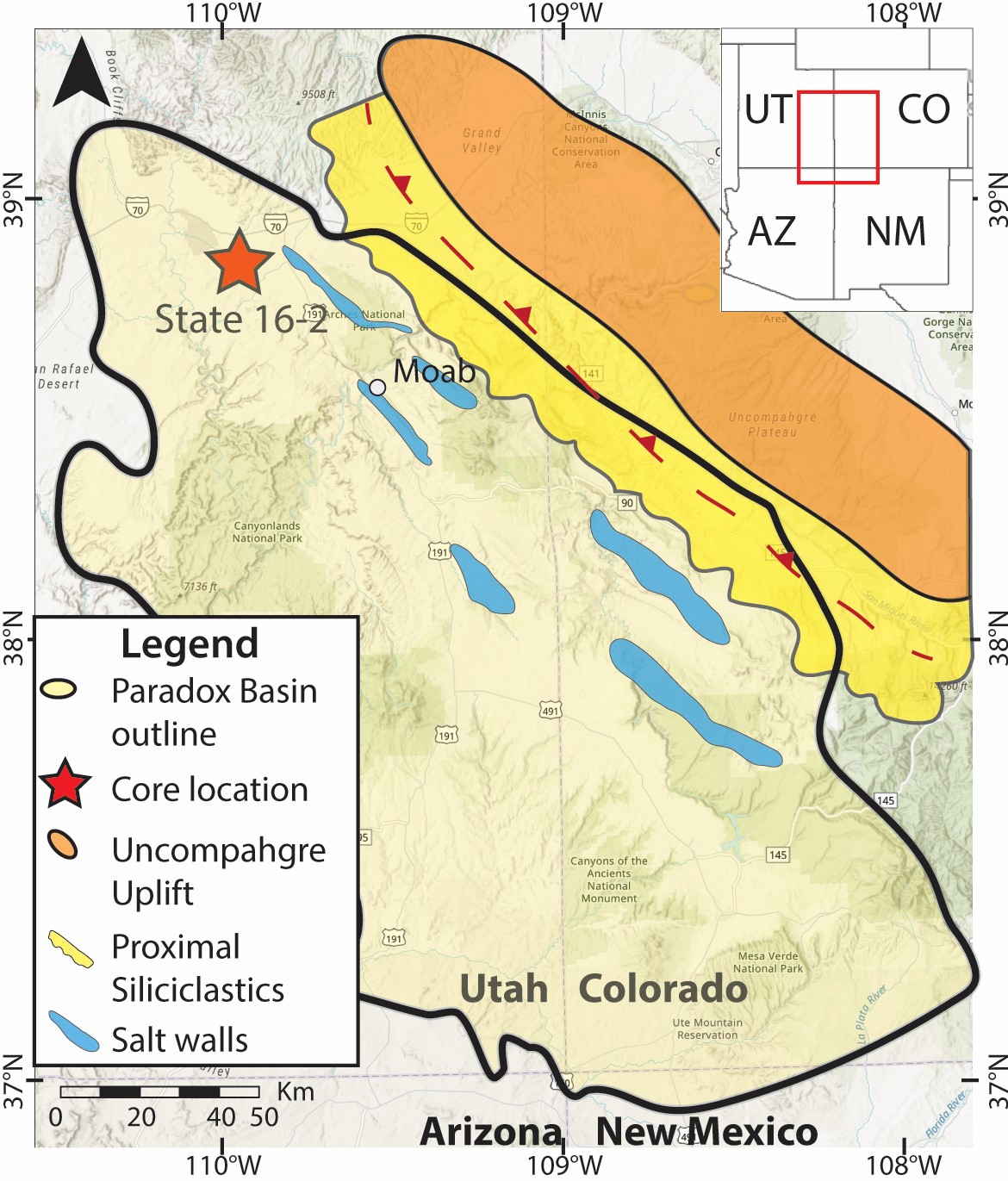 The present-day Paradox Basin is a northwest-southeast trending asymmetric flexural basin spanning southeastern Utah, southwestern Colorado, and portions of Arizona and New Mexico (Figure 1) (Barbeau, 2003; Trudgill, 2011). The Paradox Basin developed as a depression adjacent to crustal loading related to the Uncompahgre Uplift, a paleotopographic high formed due to collision between Gondwana and Laurentia. Regional uplift was initiated in the Late Mississippian and Early Pennsylvanian and formed the formation of the Ancestral Rocky Mountains during the Middle Pennsylvanian through the Permian (Stokes, 1986; Barbeau, 2003; Whidden et al., 2014). The Paradox Basin was one of many paleotopographic depressions associated with neighboring paleotopographic highs (i.e., the Ancestral Rocky Mountains) that developed during this time.