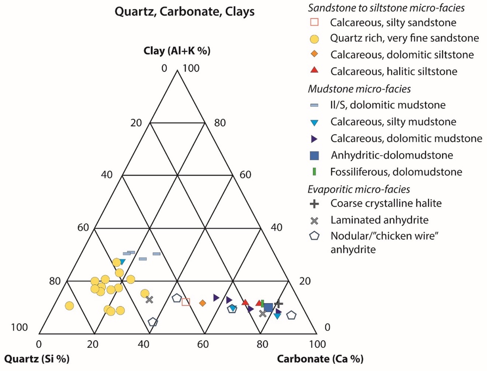 Figure 4. Ternary diagram showing the ten identified micro-facies in this study. Ternary diagram based on quartz, carbonate, and clay percentages from composite elemental EDS maps. Quartz interpreted from silicon percent. Carbonate interpreted from calcium percent. Clay interpreted from aluminum and potassium percent.