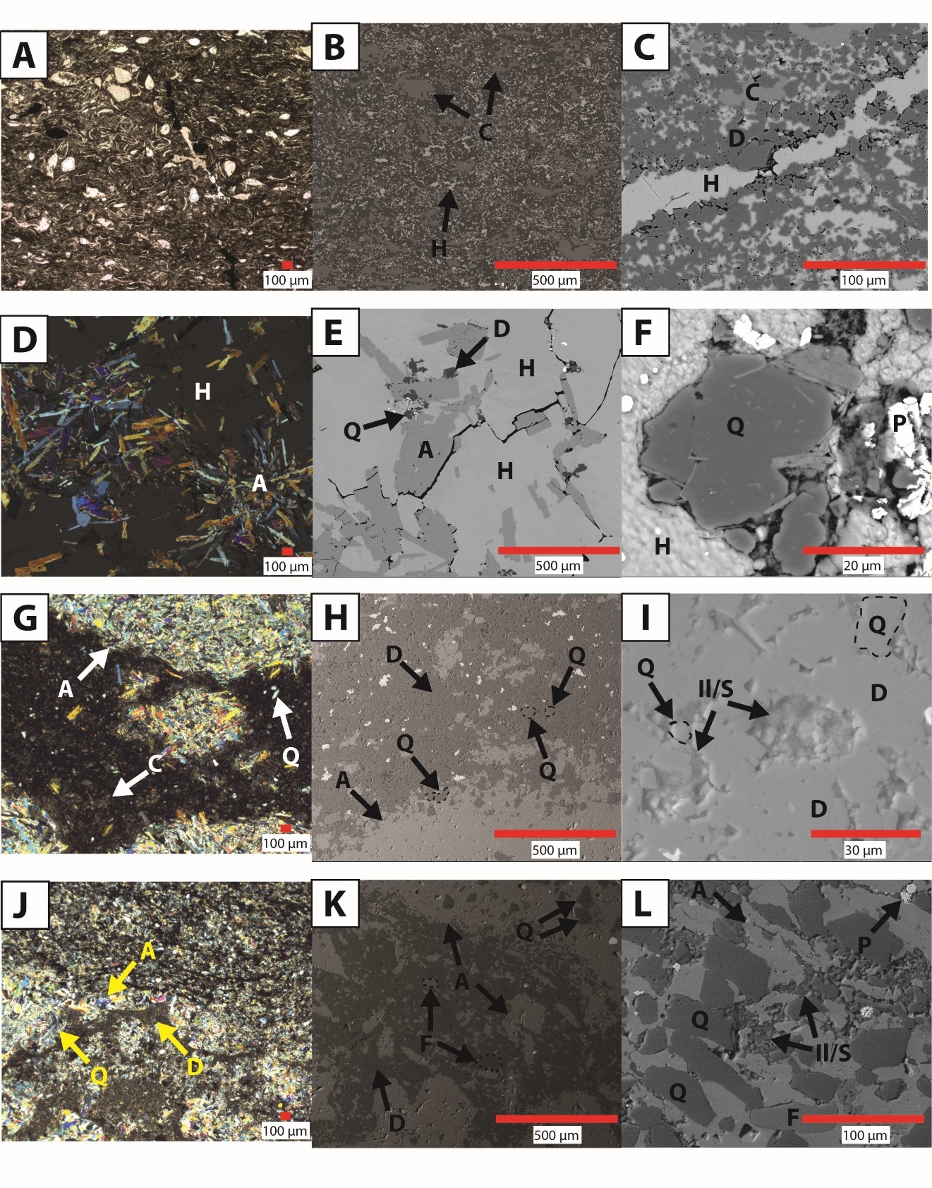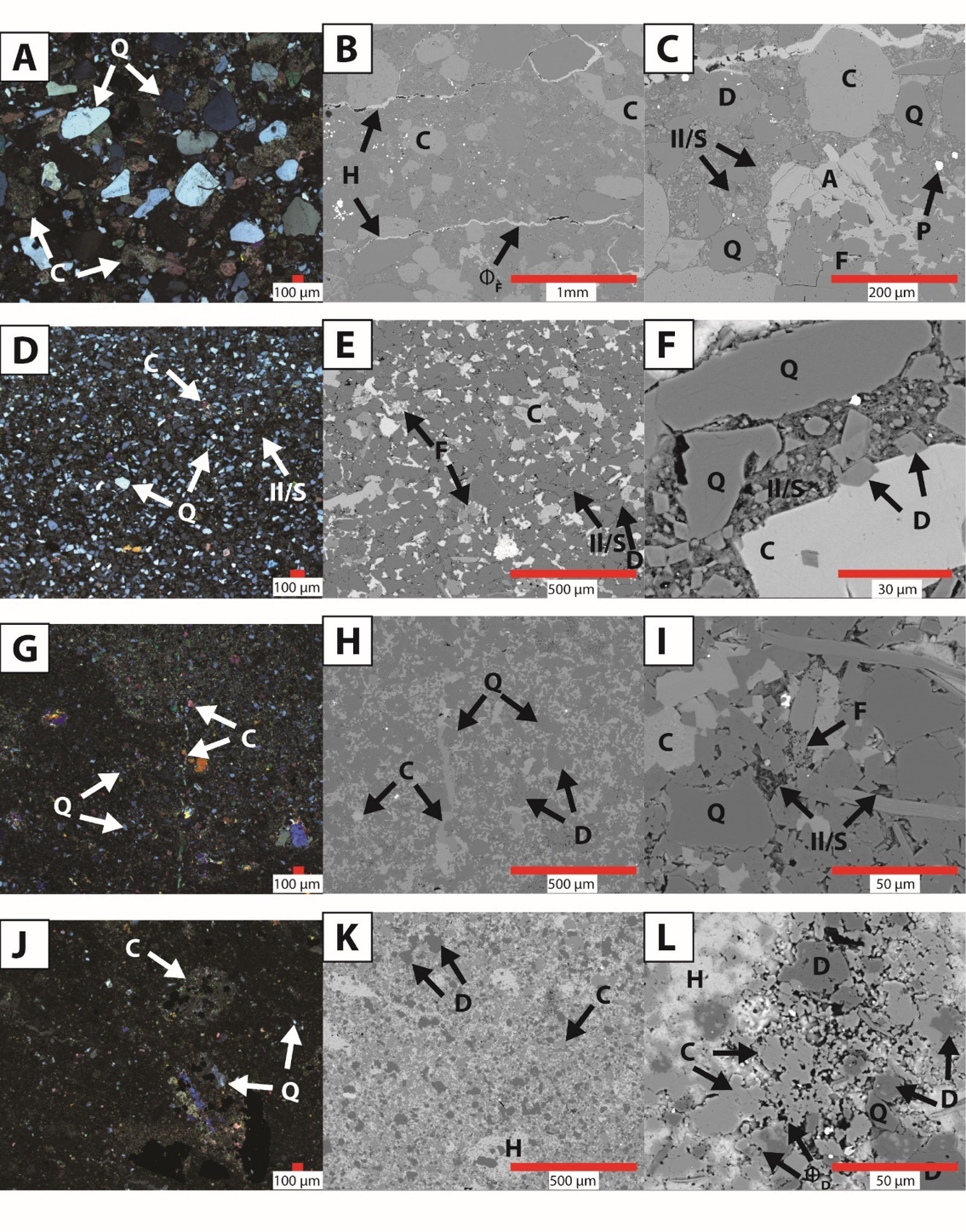 Figure 5. Petrographic and SEM analyses of sandstone to siltstone micro-facies. (Q) Quartz, (C) Calcite, (D) Dolomite, (F) Feldspar, (Il/S) Illite/smectite, (H) Halite, (P) Pyrite, and (A) Anhydrite. A-C. Calcareous, silty sandstone; 2,951 m (9,682.2’). D-F. Quartz-rich, very fine sandstone micro-facies; 2,989 m (9,706.9’). G-I. Calcareous, dolomitic siltstone micro-facies; 2,947 m (9,669.7’). J-L. Calcareous, halitic siltstone micro-facies; 2,968 m (9,736.8’).
