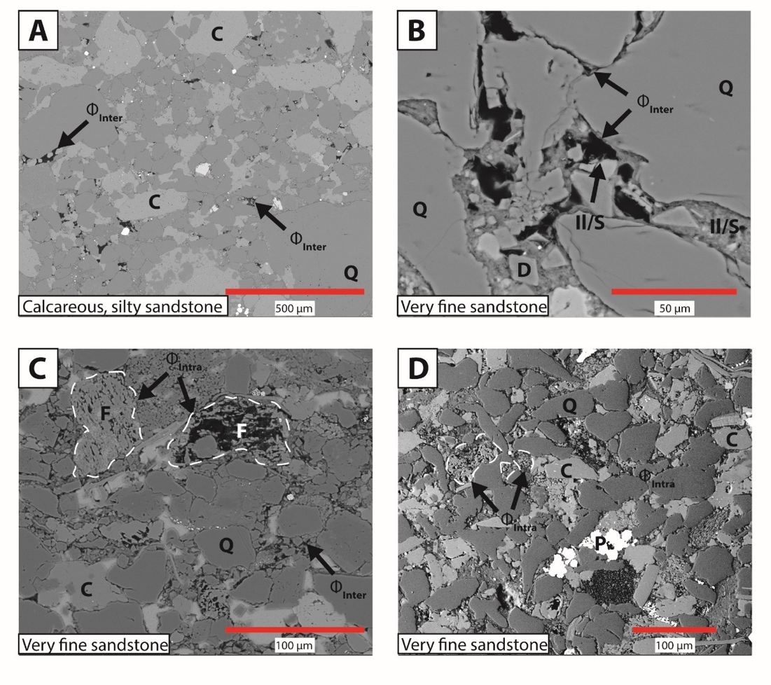 Figure 6. Dominant pore types in sandstone to siltstone micro-facies from backscatter SEM micrographs. (Q) Quartz, (C) Calcite, (D) Dolomite, (F) Feldspar, (Il/S) Illite/smectite, (P) Pyrite, (Φinter) intergranular porosity, and (Φintra) intragranular porosity. A. Calcareous, silty sandstone characterized by intergranular porosity. B. Quartz-rich, very fine sandstone characterized by intergranular porosity with illite/smectite clay domains, cement, and dolomite. C. Quartz-rich, very fine sandstone showing intragranular dissolution pores in feldspars with primary intergranular porosity. D. Quartz-rich, very fine sandstone showing intragranular dissolution pores in feldspars.