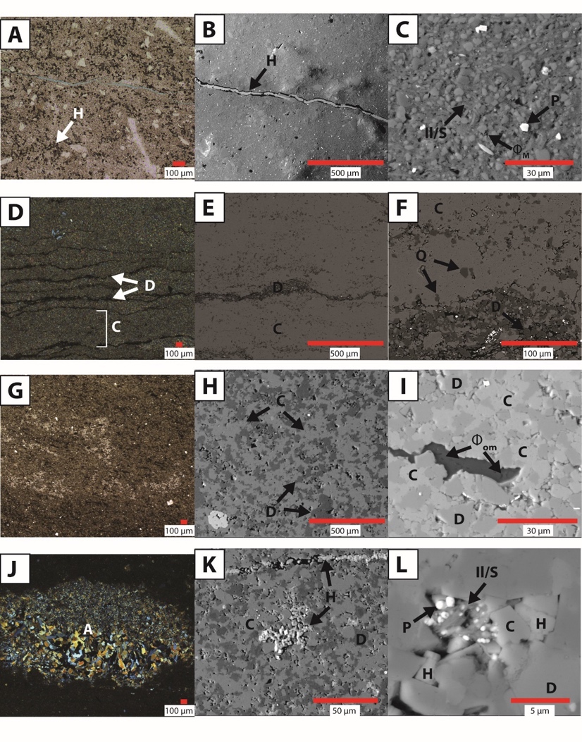 Figure 7. Petrographic and SEM images of mudstone micro-facies. (Q) Quartz, (C) Calcite, (D) Dolomite, (F) Feldspar, (Il/S) Illite/smectite, (H) Halite, (P) Pyrite, (A) Anhydrite, and (Φom) Organic-matter pores. A-C. Illite/smectite, dolomitic mudstone micro-facies; 9,686 m (9,685.9’). D-F. Calcareous, silty mudstone micro-facies; 2,941 m (9,648.7’). G-I. Calcareous, dolomitic mudstone micro-facies; 2,944 m (sample #9658.1). J-L. Anhydritic-dolomudstone micro-facies; 2,940 m (sample #9644.1).