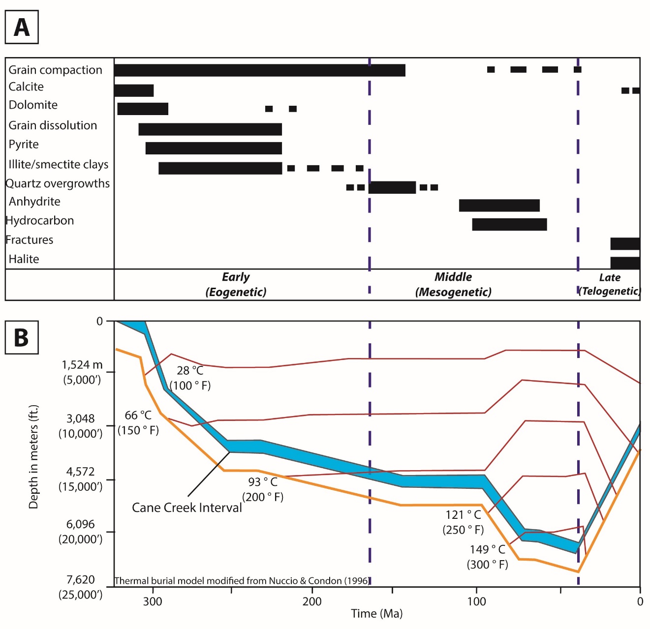 The Early (eogenesis) stage coincides with deposition and initial burial, Middle (mesogenesis) stage with continued burial and deepest basin burial, and Late (telogenesis) stage with the uplift of the basin, all of which include components that affect reservoir quality (Choquette & Pray, 1970; Burley et al., 1985; Moore, 1989). The relative timing of events with a thermal burial and hydrocarbon generation model of the Cane Creek Shale in the Moab, UT area (Nuccio & Condon, 1996) highlights major diagenetic timing events relative to tectonic events in the Paradox Basin (Figure 11B).