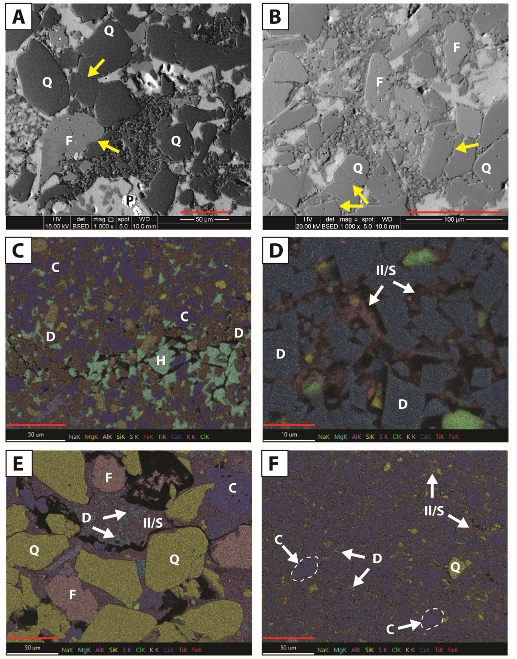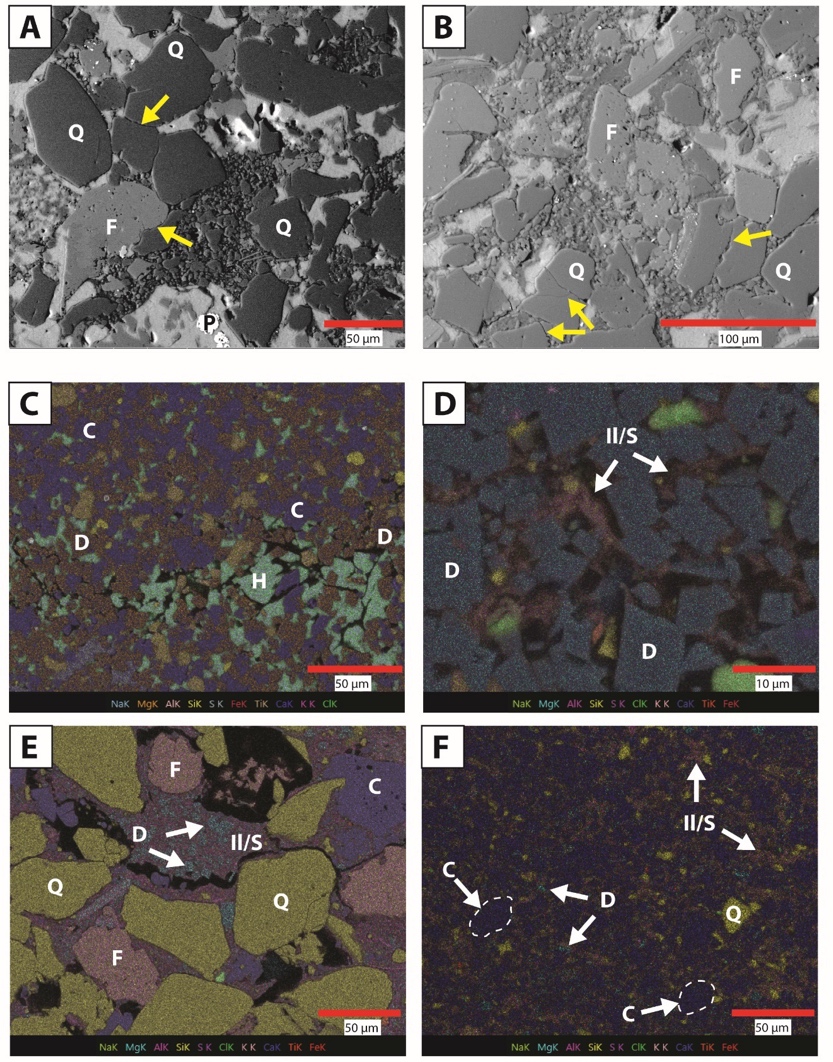 Figure 12. SEM petrographs with composite elemental EDS maps. (Q) Quartz, (C) Calcite, (D) Dolomite, (F) Feldspar, (Il/S) Illite/smectite, (H) Halite, and (P) Pyrite. A. Quartz-rich, very fine sandstone micro-facies showing evidence for feldspar dissolution developing micro-pores. Compaction features shown as grain contacts and suturing (yellow arrows); 2,939 m (9,642.9’). B. Quartz-rich, very fine sandstone micro-facies showing feldspar dissolution micro-pores and evidence for compaction as grain fractures (yellow arrows); 2,939 m (9,642.9’). C and D. Calcareous, halitic siltstone and calcareous, dolomitic siltstone micro-facies showing carbonate and dolomite grains. Note minor authigenic clays in pore network; 2,940 m and 2,947 m (9,644.1’ and 9,669.7’). E. Quartz-rich, very fine sandstone with early dolomite cement precipitating in illite/smectite domains; 2,960 m (9,711.9’). F. Illite/smectite micro-facies with illite/smectite domains and dolomite and clay cements; 2,952 m (9,683.85’).