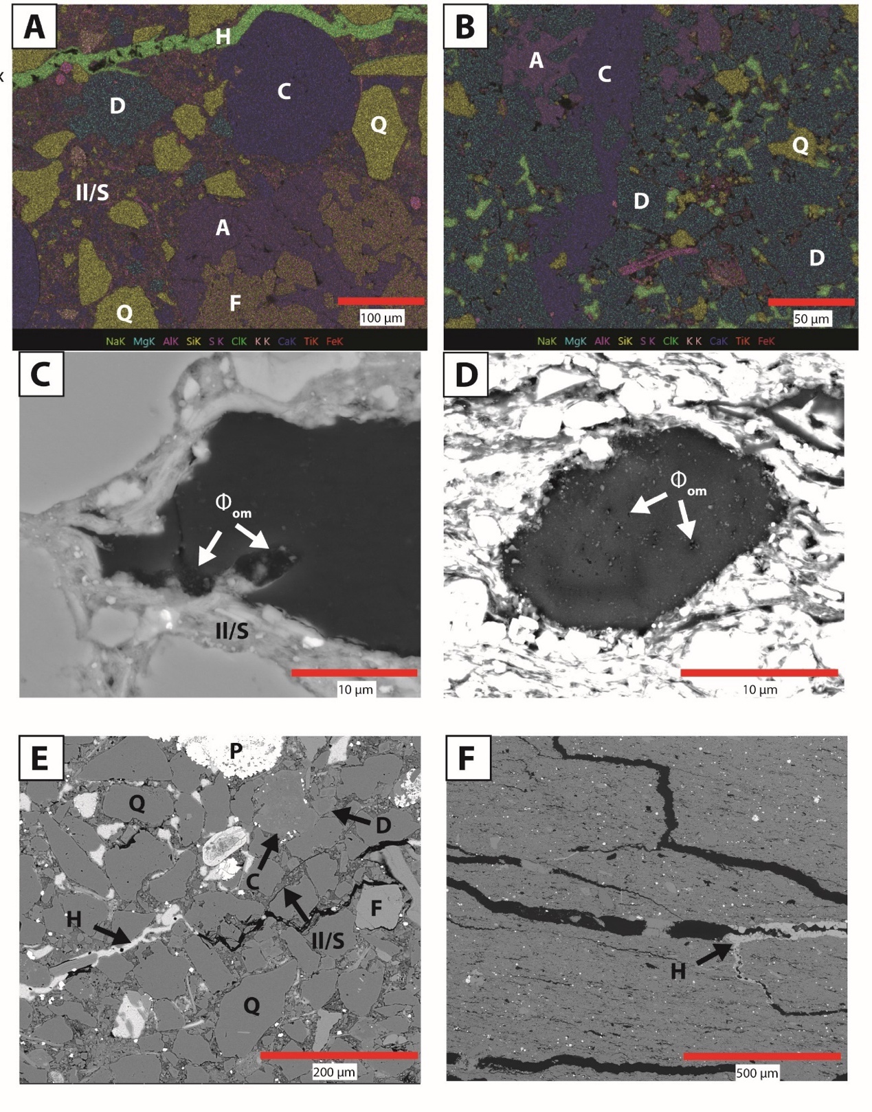 Figure 14. SEM petrographs with composite elemental EDS maps. (Q) Quartz, (C) Calcite, (D) Dolomite, (F) Feldspar, (Il/S) Illite/smectite, (H) Halite, (P) Pyrite, (Om) Organic matter, and (Φom) Organic matter porosity. A. Calcareous, silty sandstone micro-facies with abundant quartz, feldspar, and carbonate grains with pore-filling illite/smectite clay cement and anhydrite cement; 9,682.2 m (9,682.2’). B. Calcareous, dolomitic siltstone micro-facies with pore-filling anhydrite and carbonate vein cements; 2,947 m (9,669.7’). C and D. Organic matter in quartz-rich, very fine sandstone and illite/smectite dolomitic mudstone micro-facies. Note organic matter porosity and cracking in both SEM micrographs; 2,948 m and 2,950 m (9,672.2’ and 9,677.2’). E. Quartz-rich, very fine sandstone micro-facies with partially filled halite-cemented fracture; 2,959 m (9,706.9’). F. Illite/smectite dolomitic mudstone micro-facies with partially cemented halite-filled fracture; 2,945 m (9,662.4’).