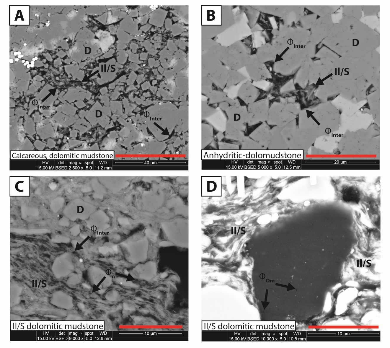 Figure 8. Dominant pore types in mudstone micro-facies from backscatter SEM micrographs. (Q) Quartz, (C) Calcite, (D) Dolomite, (F) Feldspar, (Il/S) Illite/smectite, (Φinter) intergranular porosity, (Φn) nanopores and (Φom) organic matter nanopores. A. Calcareous, dolomitic mudstone characterized by intergranular porosity. B. Anhydritic-dolomudstone characterized by intergranular porosity with illite/smectite clay domains, cement, and dolomite. C. Illite/smectite dolomitic mudstone characterized by intergranular and nanopores in illite/smectite domains. D. Illite/smectite dolomitic mudstone characterized by nanopores in illite/smectite domains and nanopores in organic matter.