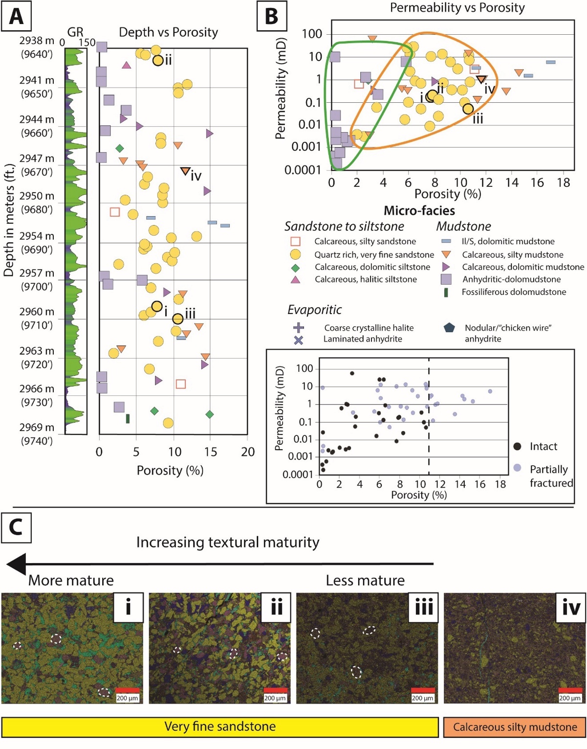 Figure 10. Porosity and permeability trends with micro-facies from SEM. A. Depth versus Porosity chart with gamma-ray (GR) log. B. Permeability versus Porosity chart. Subset image. Intact and partially fractured core plugs reported for porosity and permeability. Dashed line showing 11 % porosity. C. SEM with EDS samples showing increasing textural maturity in quartz-rich, very fine sandstone micro-facies (i, ii, and iii) with calcareous silty mudstone for comparison (iv). Feldspars are outlined in i, ii, and iii.