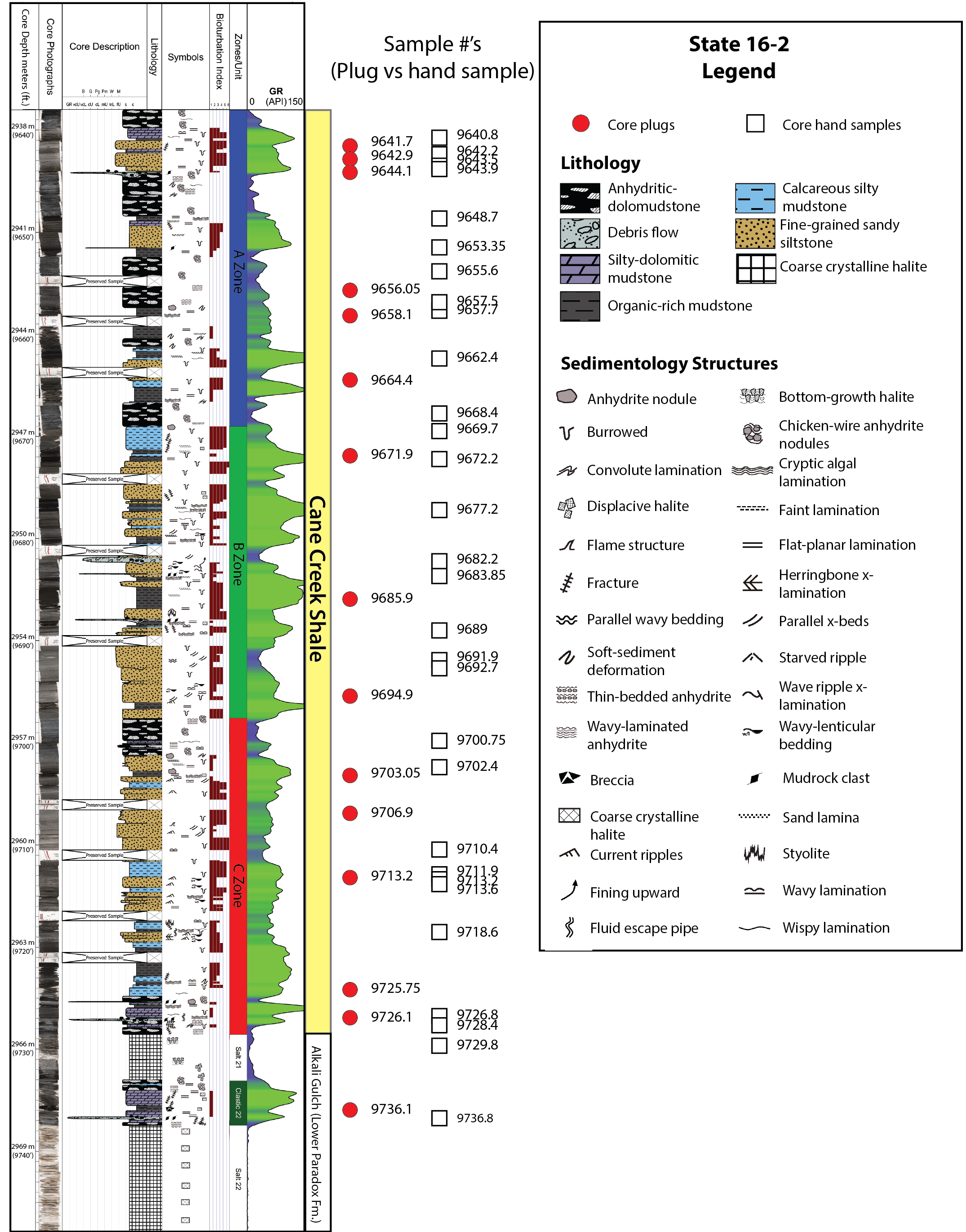 Characterization of the Cane Creek Shale is based on an approximately 30-meter cored interval of Zephyr Energy State 16-2 well from southeastern Utah near Moab, UT (Figure 1). The State 16-2 core is measured in feet but is reported herein as meters (m) and feet (’). Total cored Cane Creek Shale is from 2,938 m (9,638’) to 2,968 m (9,728’) (27 m or 90’ total) with 2,965 m (9,728’) to 2,971 m (9,748’) (6 m or 20’ total) of Salt 22, Clastic 23, and Salt 23 of the Alkali Gulch (Lower Paradox Formation) (Figure 3) (Jagniecki et al., 2019; McCormack et al., 2023). Zephyr Energy State 16-2 research well was collected from the existing State 16-42 well pad on Utah School and Institutional Trust Lands Administration (SITLA) land in the Gunnison Valley Unit, northern Paradox Basin.