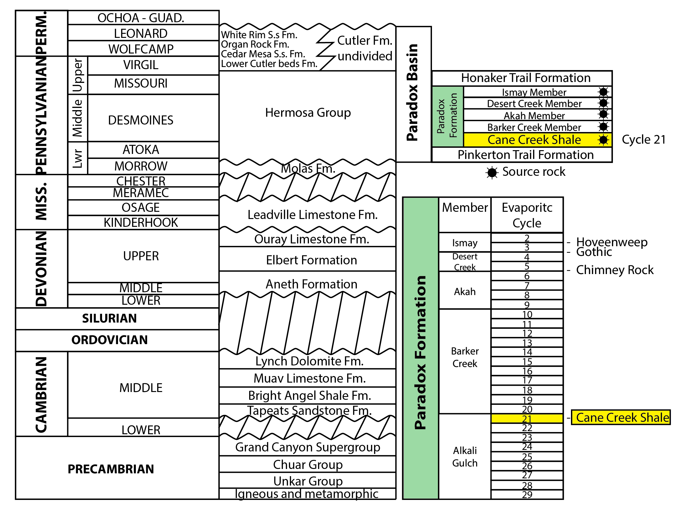 Figure 2. Paleozoic stratigraphic column. Source rock units of the Paradox Formation including the Cane Creek Shale. The Cane Creek Shale is part of Cycle 29 originally described by Hite (1960). North American geologic time scale modified from Soreghan et al. (2009), Stevenson & Wray (2009), and Whidden et al. (2013). Perm. = Permian, Miss. = Mississippian, Lwr = Lower, S.s. = Sandstone, Fm. = Formation.