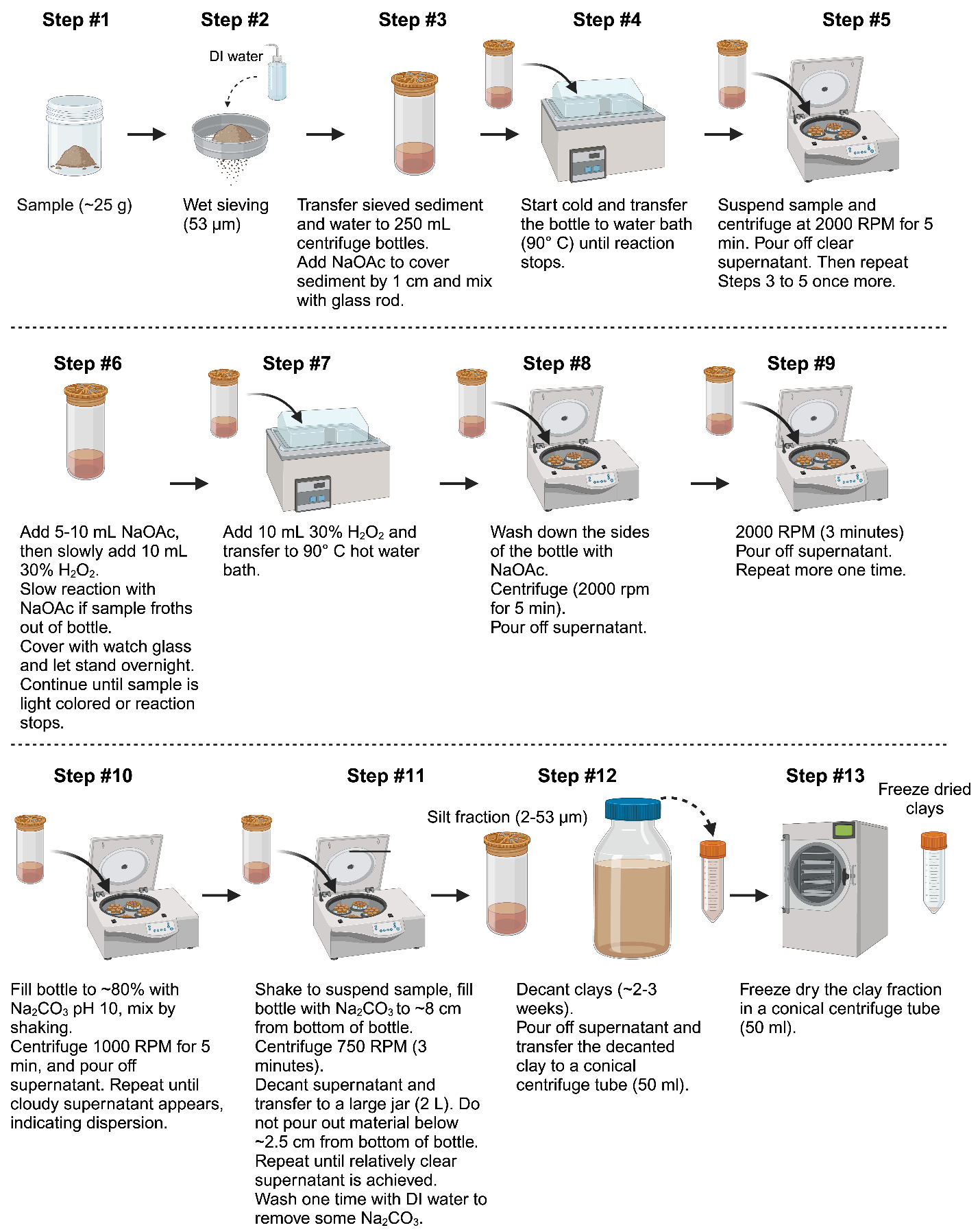 Figure 4. Flowchart created with BioRender.com that summarizes all pretreatment steps, modified from Jackson (1969). The process begins with a wet sample, dissolution of organic matter and carbonate, separation of <2 µm clays from silt (2 – 53 µm), and freeze drying of the <2 µm clays.
