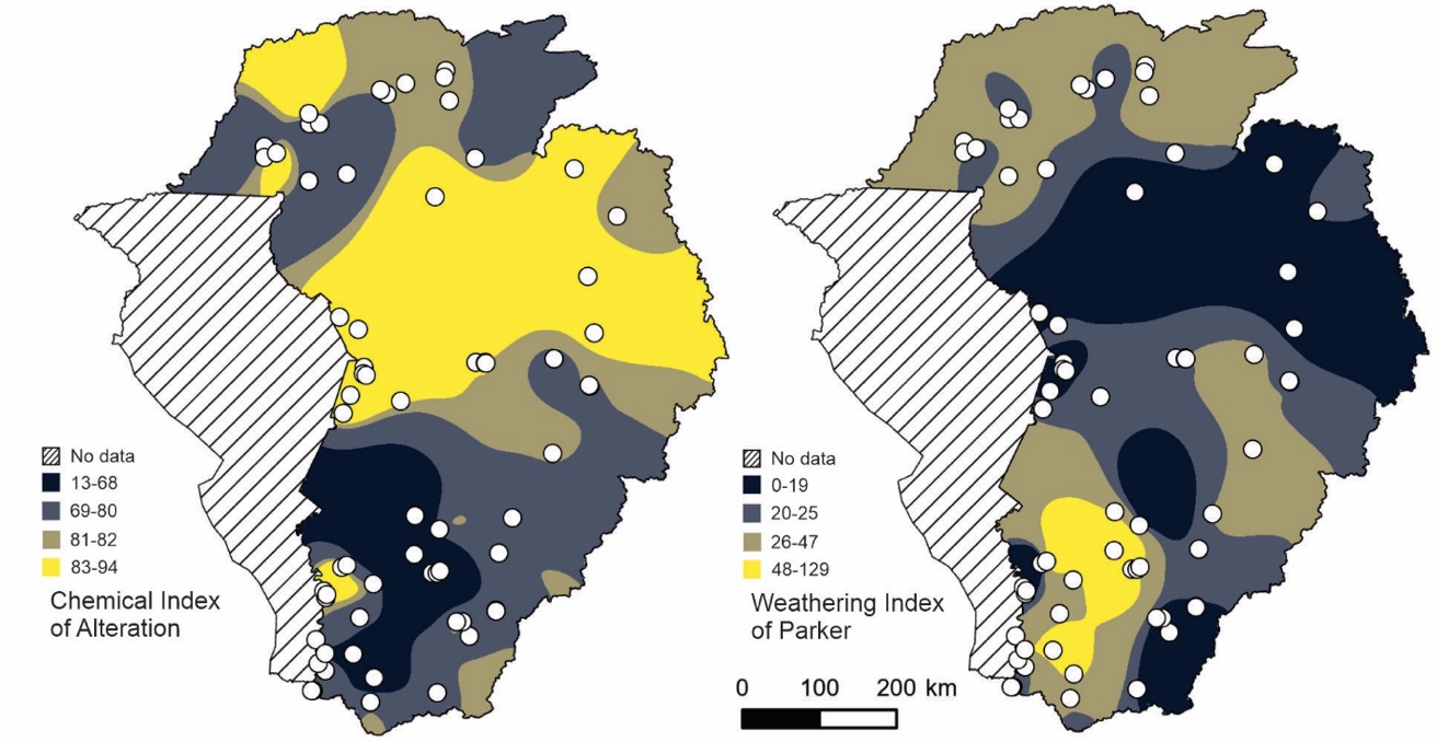 Price, J. R. & Velbel, M. A. (2003). Chemical weathering indices applied to weathering profiles developed on heterogeneous felsic metamorphic parent rocks. Chemical Geology 202: 397-416. https://doi.org/10.1016/j.chemgeo.2002.11.001