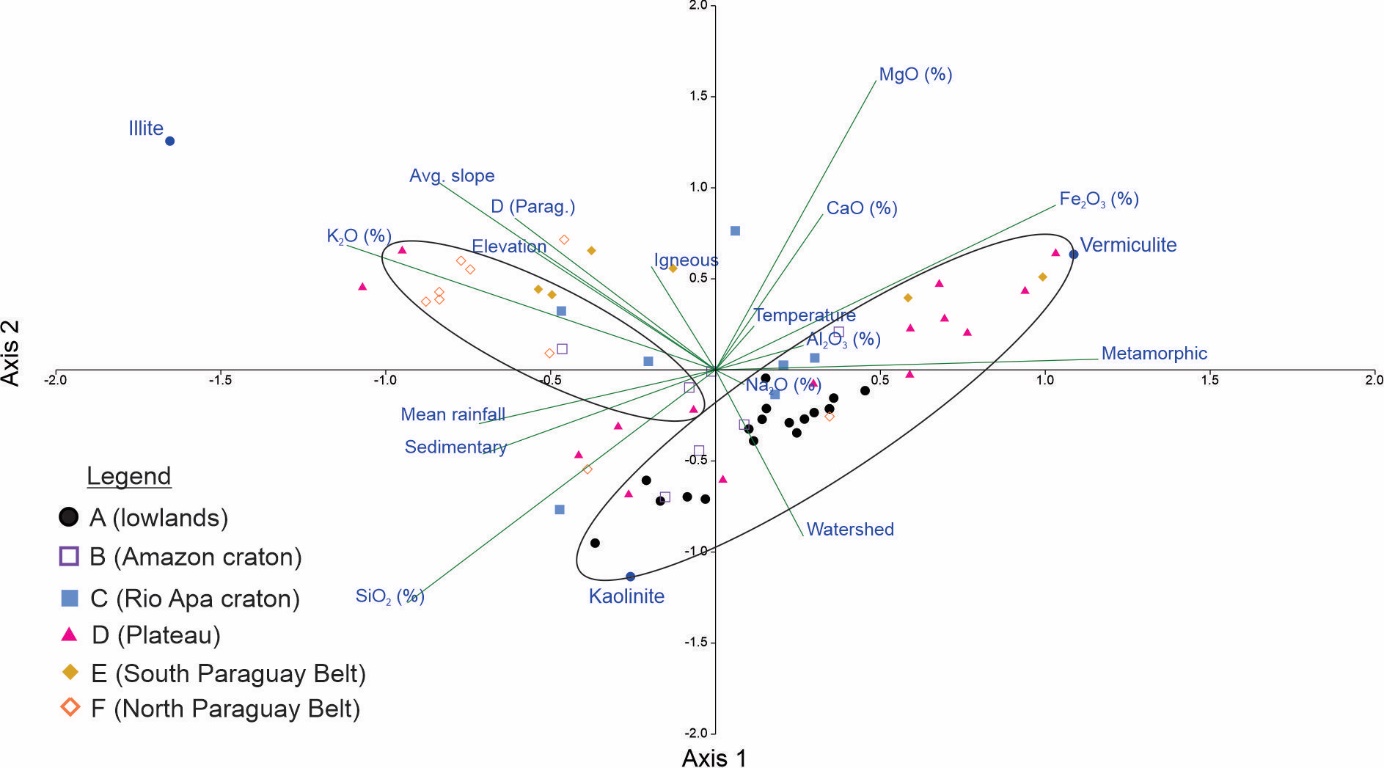 Fe2O3 and metamorphic parent lithologies loaded positively on axis 1 of the canonical correspondence analysis (Figure 11). The SiO2, K2O, and average watershed slope loaded negatively on axis 1. The average watershed slope, MgO, and Fe2O3 loaded positively whereas watershed area, sedimentary parent rocks, and SiO2 loaded negatively on axis 2. All lowland samples plotted in negative axis 2 space, whereas most of the Paraguay Belt samples plotted in positive axis 2 space. Two large clusters of data points are distinguishable. The first cluster is oriented diagonally along a continuum formed by the SiO2 and Fe2O3 rays with n = 44 sampling stations. The samples with more SiO2 are located in the same quadrant with kaolinite, and samples with more Fe2O3 are associated with vermiculite. The quadrant with vermiculite is characterized by significantly more MgO and slightly more Al2O3, as suggested by the length of the shorter ray for Al2O3. The second cluster of data is oriented perpendicular to the first cluster, composed mostly of Paraguay Belt samples and associated with illite, K2O, average watershed slope, and elevation of the sampling stations.
