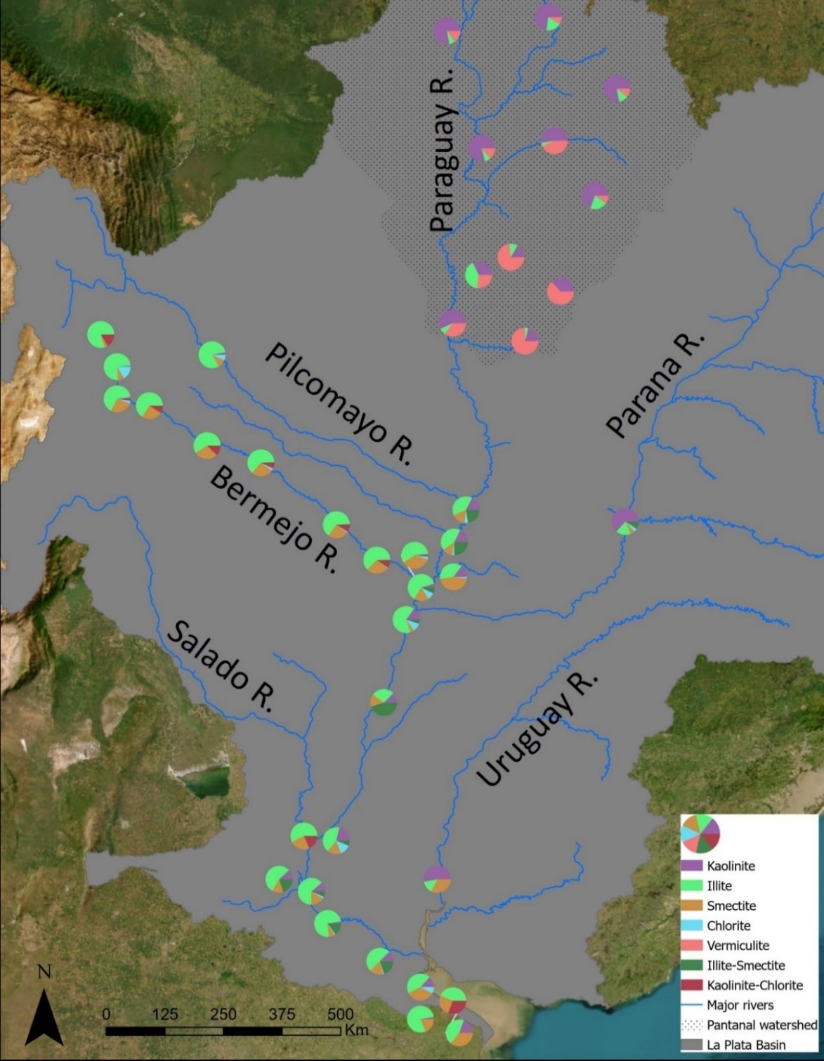 In this study, modern muds in the rivers of the Pantanal were collected to evaluate their mineralogy and chemical composition. We employed X-ray diffraction (XRD) for semi-quantitative clay mineralogy and wavelength-dispersive X-ray fluorescence (WD-XRF) to deduce major elemental geochemistry (Moore & Reynolds, 1989). These data were analyzed along with environmental characteristics of the basin’s sub-watersheds (e.g., slope, lithology, precipitation, elevation) to elucidate the processes that control clay composition. We tested the hypothesis that differences in mean annual precipitation control the clay mineral assemblage in modern fluvial silt plus clay in the Pantanal. This article is a companion study to a petrographic analysis of contemporary river sands in the Pantanal (Lo et al., 2023), with the end goal of identifying major patterns in sediment generation and transport in this basin. Plata River samples were integrated with this study to evaluate the influence of Pantanal Basin clay composition on downstream sediments. Ultimately, our objective is to improve interpretations of ancient sedimentary rocks in similar settings through a detailed set of modern observations and a database of mineralogical and chemical measurements.