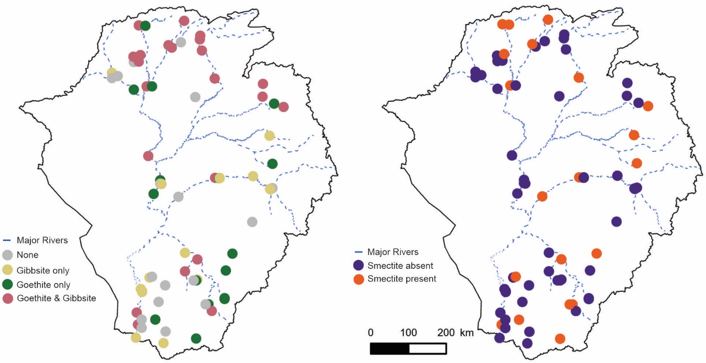 Gibbsite and goethite are not abundant clay minerals in samples from the Pantanal (25% of samples contained neither of these minerals), but they do constitute important minor components (Figure 7). Sampling stations with both gibbsite and goethite were most frequently present in the north plateau region, where the mean annual precipitation in the basin is the greatest (Figure 3A). Gibbsite was most common in samples along the Taquari River megafan, whereas goethite occurred in samples from the southern plateau and in the medial lowlands (Figure 7A). Samples with neither mineral were common in the Rio Apa craton in the southern Pantanal. Smectite was identified in ~30% of the 71 sampling stations (Figure 7B). The presence of smectite appeared to be distributed across the Pantanal Basin with no specific pattern.